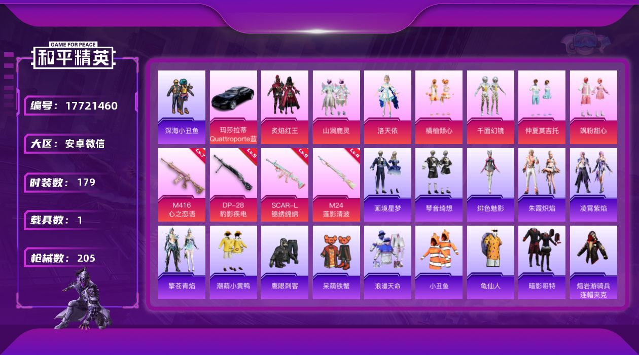 [17721460]【店主推荐捡漏号】安卓 微信-7粉装-6特效枪-1载具-2粉色飞行器-64945热力值-10王牌印记-179套装-205枪皮【热门品类】:套装-浪漫天命,套装-深海小丑鱼,套装-小丑鱼,套装-龟仙人,套装-潮萌小黄鸭,套装-暗影哥特,熔岩游骑兵连帽夹克【粉色套装】:粉装-炙焰红王,粉装-山涧鹿灵,角色-洛天依,粉装-橘柚倾心,粉装-千面幻镜,粉装-仲夏莫吉托,粉装-飒粉甜心【粉色枪皮等级】:SCAR-L-锦绣绵绵(五级),M416-心之恋语(七级),ACE32-萌骑漫游(五级),M24-莲影清波(四级),Mk14-福马献瑞(三级),DP-28-豹影疾电(五级)【粉色载具】:玛莎拉蒂Quattroporte(夜幕蓝)【粉色枪皮】:SCAR-L-锦绣绵绵,M416-心之恋语,ACE32-萌骑漫游,M24-莲影清波,Mk14-福马献瑞,DP-28-豹影疾电