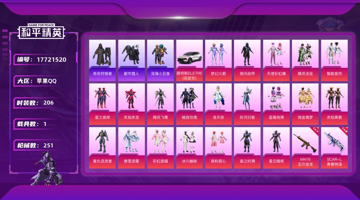 [17721520]苹果 手Q-21粉装-11特效枪-1载具-4粉色飞行器-86159热力值-10王牌印记-206套装-251枪皮
