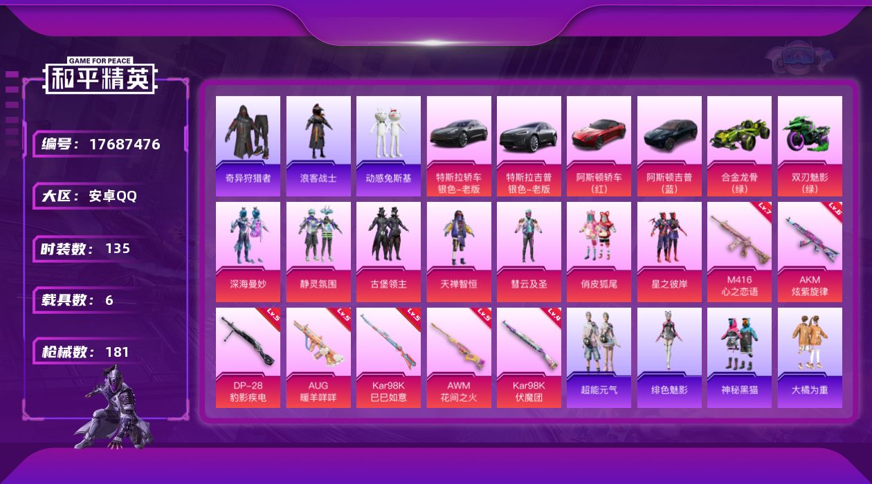 [17687476]【特价出售/店主推荐】 安卓 手Q-7粉装-7特效枪-6载具-5粉色飞行器-71580热力值-7王牌印记-135套装-181枪皮 【热门品类】:套装-奇异狩猎者,套装-浪客战士,套装-动感兔斯基人偶服,套装-龟仙人,套装-粉红小猪 【粉色套装】:粉装-深海曼妙,粉装-静灵氛围,粉装-古堡领主,粉装-天禅智恒,粉装-彗云及圣,粉装-俏皮狐尾,粉装-星之彼岸 【粉色枪皮等级】:AKM-炫紫旋律(六级),M416-心之恋语(七级),AUG-暖羊咩咩(五级),Kar98K-伏魔团(四级),Kar98K-巳巳如意(五级),AWM-花间之火(五级),DP-28-豹影疾电(五级) 【粉色载具】:特斯拉Model 3(冷光银),特斯拉Model X(冷光银),阿斯顿马丁DBS(红),阿斯顿马丁DBX(蓝),合金龙骨(绿),双人摩托-双刃魅影(绿) 【粉色枪皮】:AKM-炫紫旋律,M416-心之恋语,AUG-暖羊咩咩,Kar98K-伏魔团,Kar98K-巳巳如意,AWM-花间之火,DP-28-豹影疾电 【粉色飞行器】:深海曼妙飞行器,炫紫旋律飞行器,古堡领主飞行器,马卡龙飞行器,齐天大圣飞行器 【粉色降落伞】:深海曼妙降落伞,PEL轰鸣竞梦者降落伞,神秘黑猫降落伞,古堡领主降落伞,繁花小夜曲降落伞,花间之火降落伞,香水柠檬降落伞,圣堂之誓降落伞,月影灵韵降落伞,幻彩电音降落伞,冷漠罗丽降落伞,镜花水月降落伞 【稀有套装】:套装-龟仙人,套装-巳巳如意,套装-超能元气,套装-雪国风尚,套装-糖糖葫芦,套装-青团波波,套装-棉花软糖,角色-都市丽猫,套装-燕燕于飞,套装-鱼渊荷华,套装-云朵鹅,套装-雪绒豹,角色-灵公主,角色-绯色魅影 【稀有枪皮】:AKM-PEL轰鸣竞梦者,AKM-奇异狩猎者,AKM-玉龙,AKM-霓虹街区,M16A4-机械英豪,SCAR-L-浪客战士,SCAR-L-玉兔迎春,SCAR-L-甜蜜誓约,SCAR-L-繁花小夜曲,SCAR-L-红色方程式,M416-动感兔斯基,M416-潮汐统领,M416-神秘黑猫,M416-糯团青竹,M416-红色方程式,GROZA-治愈之星,GROZA-马卡龙,AUG-天降萌叽,AUG-耀粉歌者,AUG-绝对恒星,QBZ-原初圣火,QBZ-彩虹符号,QBZ-神秘黑猫,M762-乘风破浪,M762-奇异狩猎者,M762-深海曼妙,M7