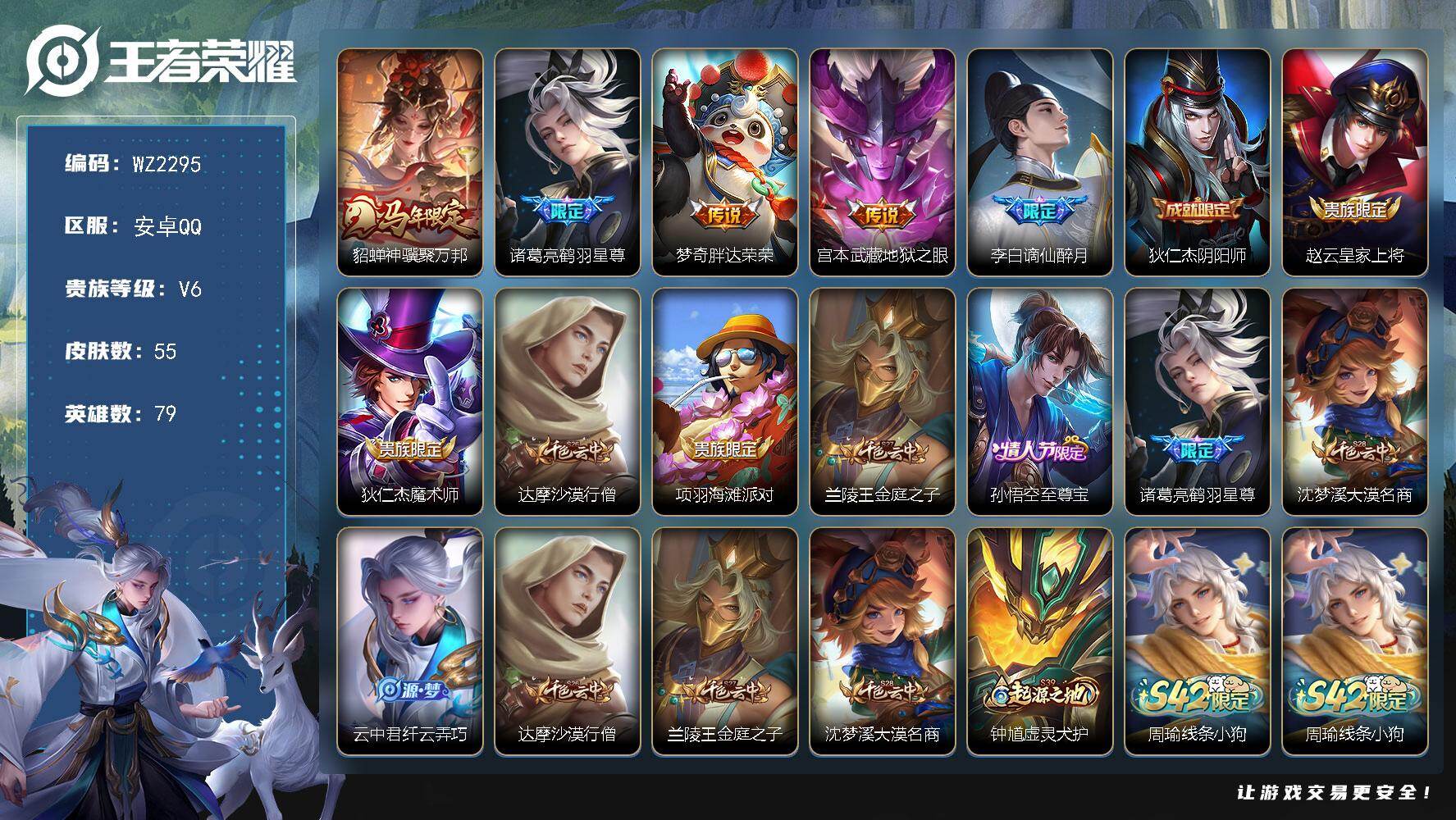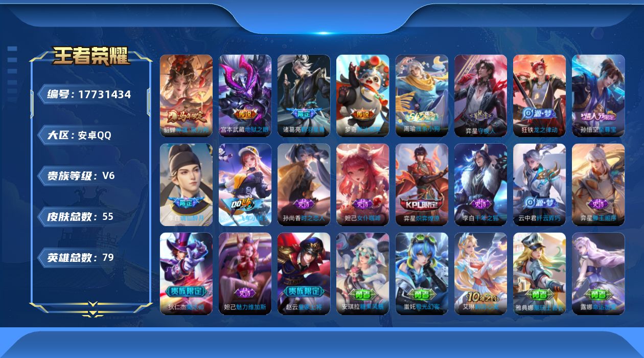 [17731434]安卓Q-55皮肤-4传说-14史诗 【传说皮肤】:貂蝉神骥聚万邦,诸葛亮鹤羽星尊,梦奇胖达荣荣,宫本武藏地狱之眼 【限定皮肤】:李白谪仙醉月,狄仁杰阴阳师,赵云皇家上将,狄仁杰魔术师,达摩沙漠行僧,项羽海滩派对,兰陵王金庭之子,孙悟空至尊宝,诸葛亮鹤羽星尊,沈梦溪大漠名商,云中君纤云弄巧 【赛季限定】:达摩沙漠行僧,兰陵王金庭之子,沈梦溪大漠名商,钟馗虚灵犬护 【战令限定】:周瑜线条小狗 【史诗皮肤】:周瑜线条小狗,弈星守夜人,狂铁龙之律动,姬小满飞车小橘子,李白谪仙醉月,弈星炽弈燎原,弈星滕王阁序,云中君纤云弄巧,孙尚香时之恋人,孙悟空至尊宝,李白千年之狐,妲己女仆咖啡,妲己魅力维加斯,狄仁杰魔术师,赵云皇家上将 【其他皮肤】:安琪拉糖果风暴,蚩奼极光幻客,艾琳鹤鸣心笺,雅典娜潮玩士官长,露娜命运加冕,阿古朵布丁狗之约,小乔秘证寻踪,钟馗虚灵犬护,沈梦溪大漠名商,兰陵王金庭之子,达摩沙漠行僧,诸葛亮掌控之力,孙尚香沉稳之力,王昭君幻想奇妙夜,墨子进击墨子号,狄仁杰阴阳师,甄姬花好人间,亚瑟死亡骑士,白起白色死神,露娜哥特玫瑰,项羽海滩派对,桑启画中游,金蝉前尘,曜归虚梦演,云中君荷鲁斯之眼,嫦娥露花倒影,伽罗花见巫女,孙策海之征途,元歌午夜歌剧院,弈星踏雪寻梅,百里守约绝影神枪,铠龙域领主,兰陵王隐刃,孙悟空西部大镖客,貂蝉异域舞娘,高渐离金属狂潮 【营地ID】:1620174300