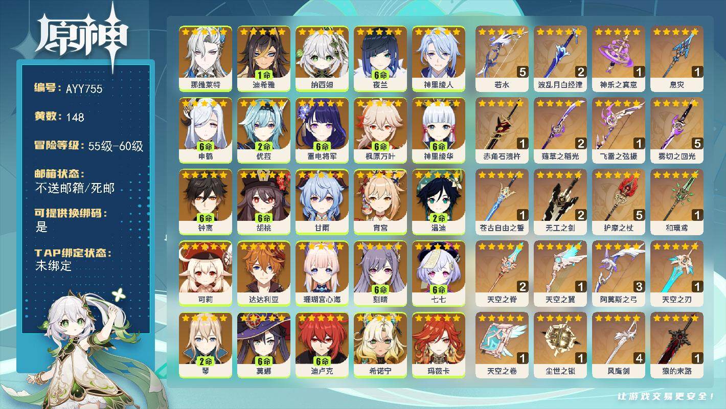 [17731969]【店主推荐捡漏号/高练度精品号】60级/148黄/女主/27个五星角色/25个五星武器 0命那维莱特,1命迪希雅,0命纳西妲,满命夜兰,0命神里绫人,满命申鹤,2命优菈,满命雷电将军,满命枫原万叶,满命神里绫华,满命钟离,满命胡桃,0命甘雨,0命宵宫,2命温迪,0命可莉,0命达达利亚,0命珊瑚宫心海,满命刻晴,满命七七,2命琴,满命莫娜,满命迪卢克,0命希诺宁,0命玛薇卡,0命瓦雷莎,0命伊涅芙,精5若水,精2波乱月白经津,精1神乐之真意,精1息灾,精1赤角石溃杵,精2薙草之稻光,精1飞雷之弦振,精5雾切之回光,精1苍古自由之誓,精2无工之剑,精5护摩之杖,精1和璞鸢,精2天空之脊,精1天空之翼,精3阿莫斯之弓,精1天空之刃,精1天空之卷,精1尘世之锁,精4风鹰剑,精1狼的末路,精3天空之傲,精1祭星者之望