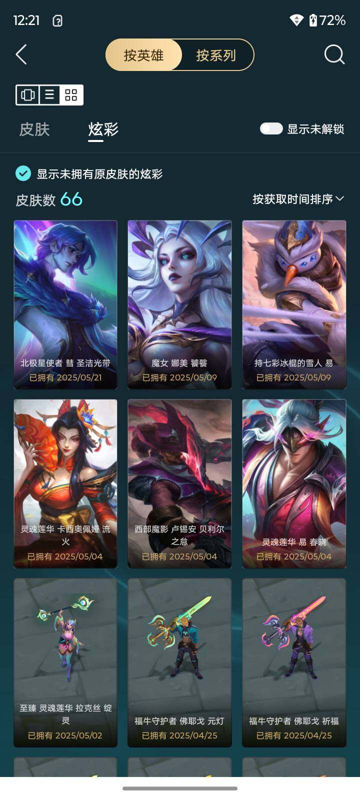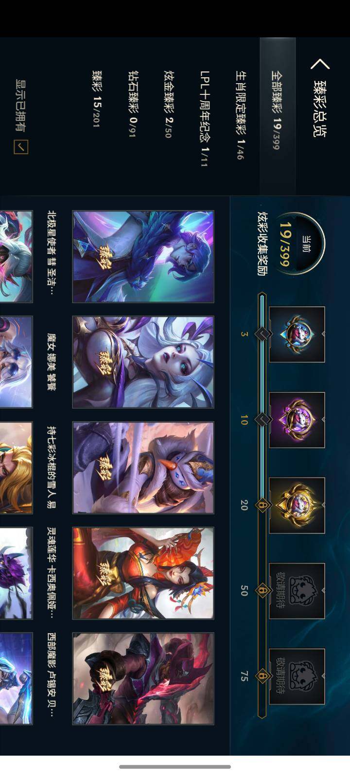 【臻彩皮肤】:天龙之子卡莎飞龙乘云,巅峰剑仙菲奥娜天神下凡,墨之影武者亚索金墨耀影,心之钢伊泽瑞尔金声玉振,源计划毁灭派克幻灭,西部魔影卢锡安贝利尔之怠,天煞劫恒星游历者,泳池派对菲奥娜清凉苹果冰,灵魂莲华卡西奥佩娅流火,持七彩冰棍的雪人易,魔女娜美饕餮,魔女阿卡丽虚荣,净雪之月莫甘娜冬虹,腥红之月劫鹤雪,斗魂觉醒伊芙琳幻之魂焰,心之钢伊泽瑞尔天纵才华,北极星使者彗圣洁光带