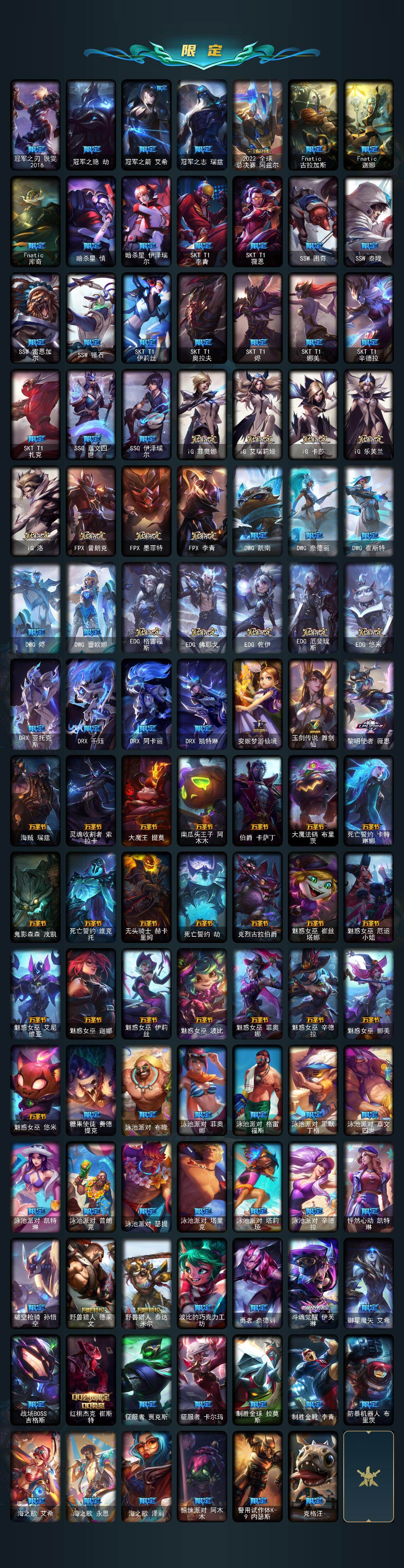 【限定皮肤】:冰原核弹古拉加斯,诸神的黄昏泰达米尔,奥斯曼大帝泰达米尔,创星之灵璐璐,送披萨的小姐姐希维尔,冠军典狱长锤石,冠军之矛卡莉丝塔,冠军之刃锐雯2016,冠军之隐劫,冠军之箭艾希,冠军之志瑞兹,2022全球总决赛阿兹尔,Fnatic古拉加斯,Fnatic迦娜,Fnatic库奇,暗杀星慎,暗杀星伊泽瑞尔,SKTT1李青,SKTT1薇恩,SSW图奇,SSW泰隆,SSW雷恩加尔,SSW锤石,SKTT1伊莉丝,SKTT1奥拉夫