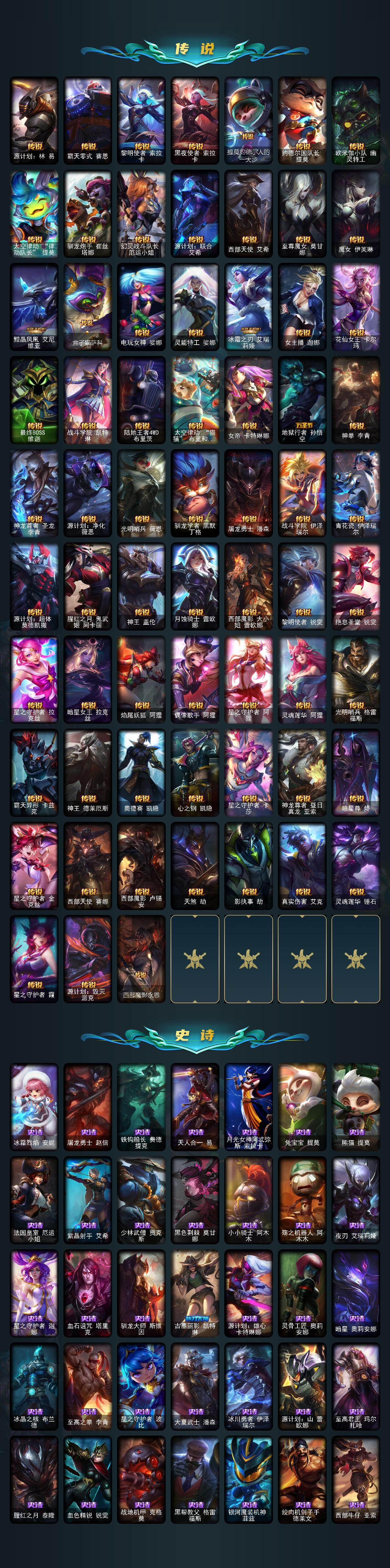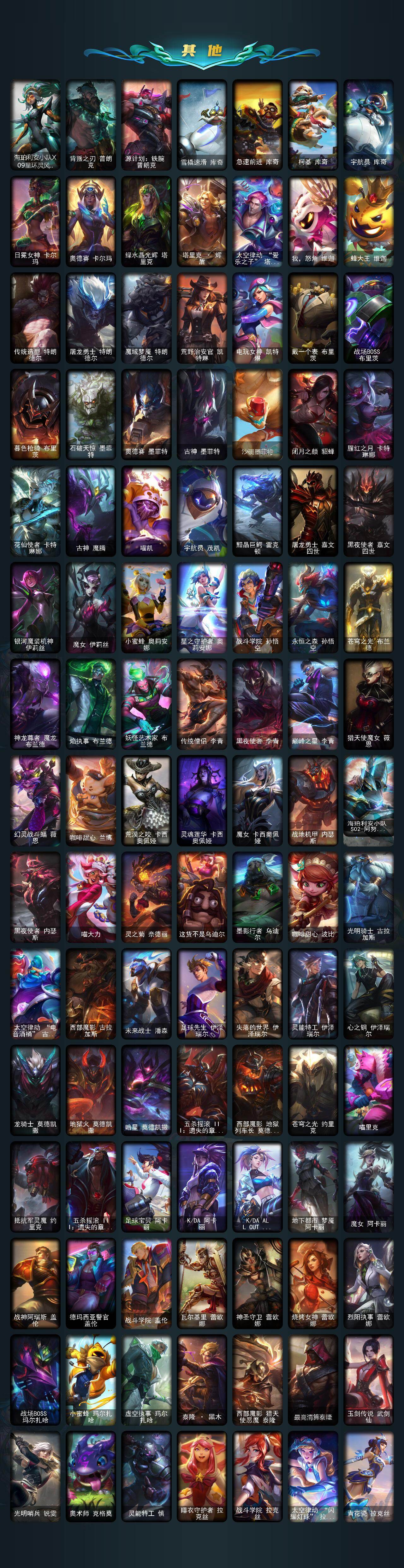 【冰雪限定】:幸福女神乐芙兰,持胡萝卜的雪人易,圣诞开心鬼提莫,圣诞精灵崔丝塔娜,圣诞狂欢基兰,阿木木“主人不要我了”,平安夜女神娑娜,英勇玩具兵普朗克,冬季仙境卡尔玛,邪恶圣诞老人维迦,夺命美人卡特琳娜,圣诞玩偶波比,冰雪驯鹿波比,圣诞老人古拉加斯,魄罗骑士瑟庄妮,雪球也能爆炸吉格斯,寒冬精灵璐璐,圣诞老人布隆,圣诞捣蛋鬼金克丝,冰雪节辛吉德,冰雪节玛尔扎哈,冰雪节格雷福斯,冰雪兽纳尔,北极星圣贤基兰,北极星猎人斯维因,北极星使者彗