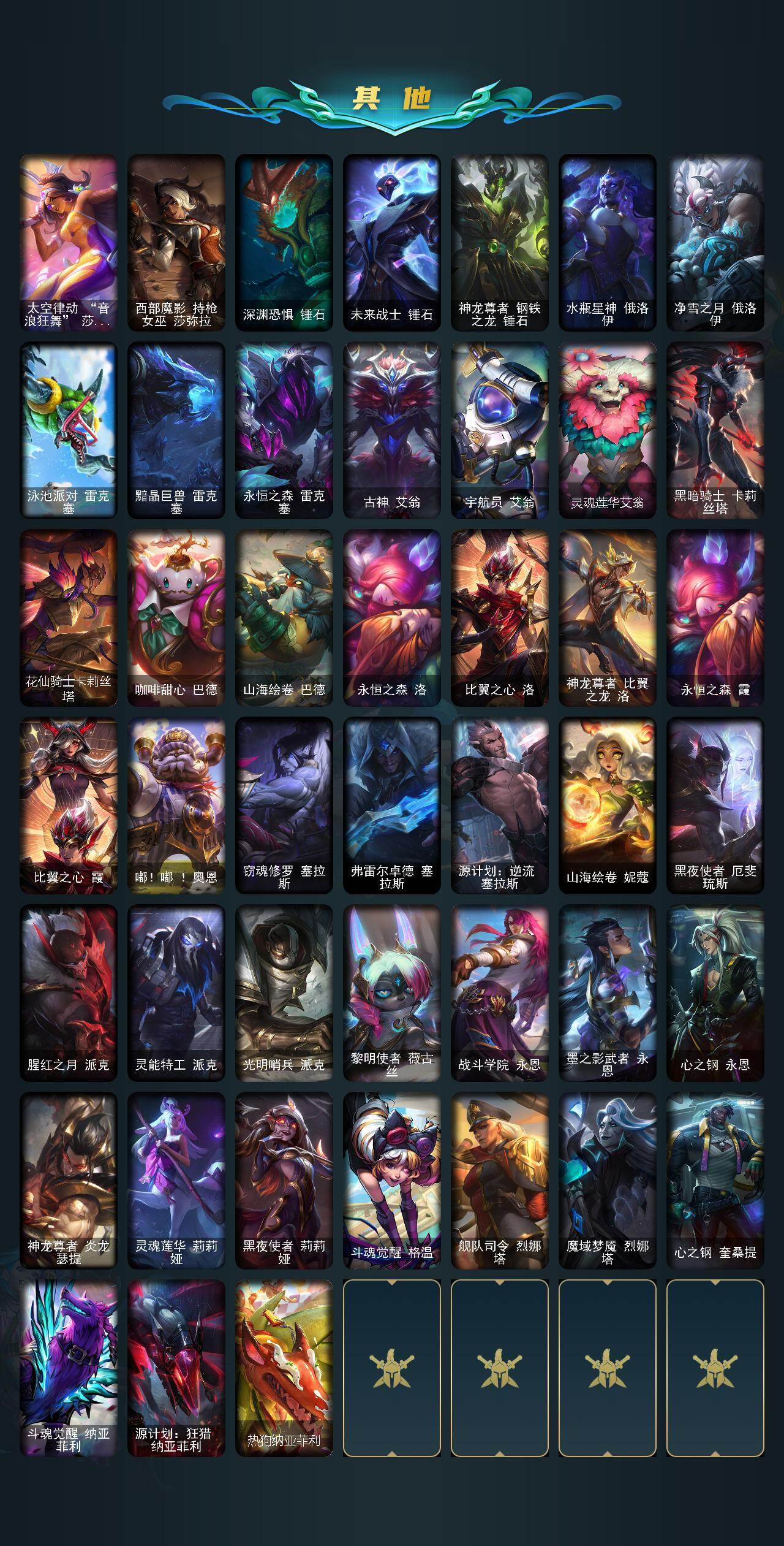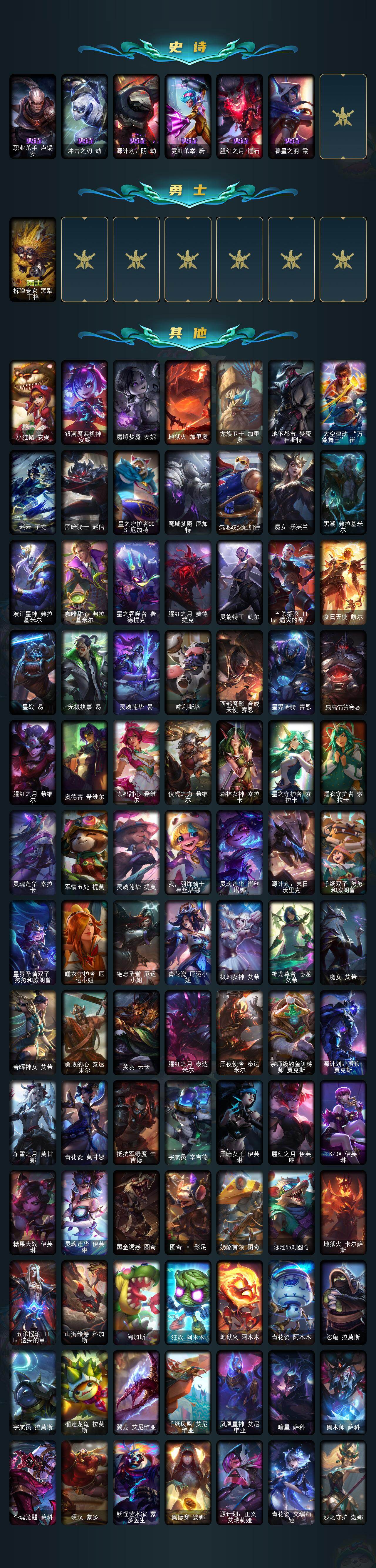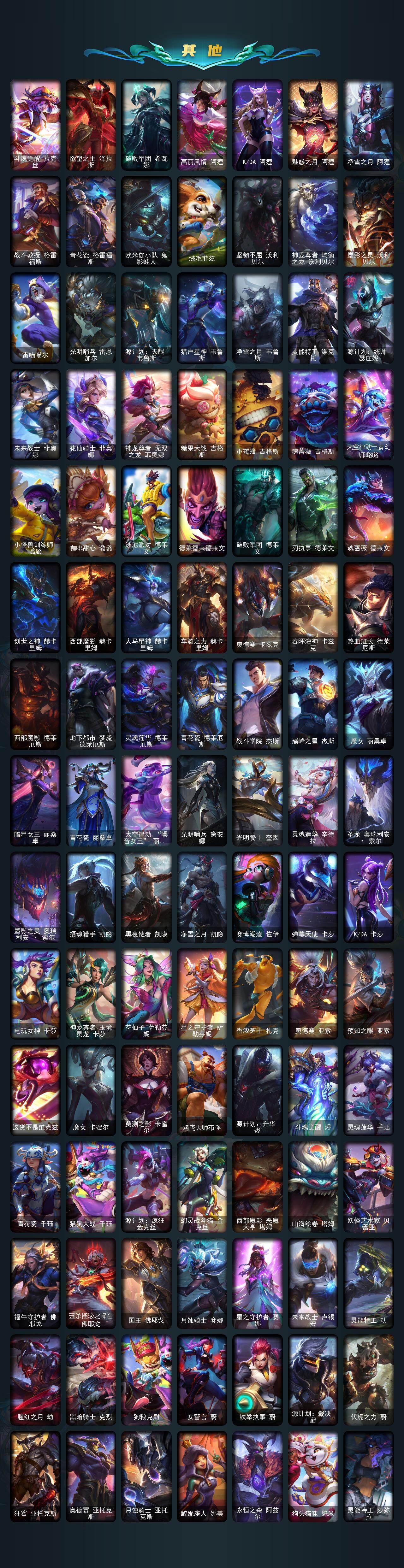 【终极皮肤】:大元素使拉克丝,DJ娑娜,KDAALLOUT萨勒芬妮独立音乐人,灵魂守卫乌迪尔,未来战士伊泽瑞尔,武装战姬厄运小姐