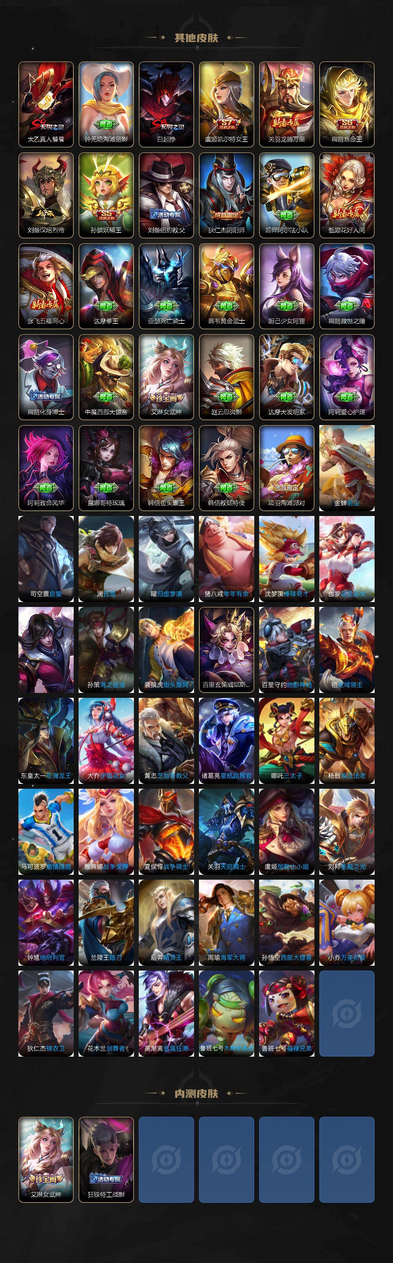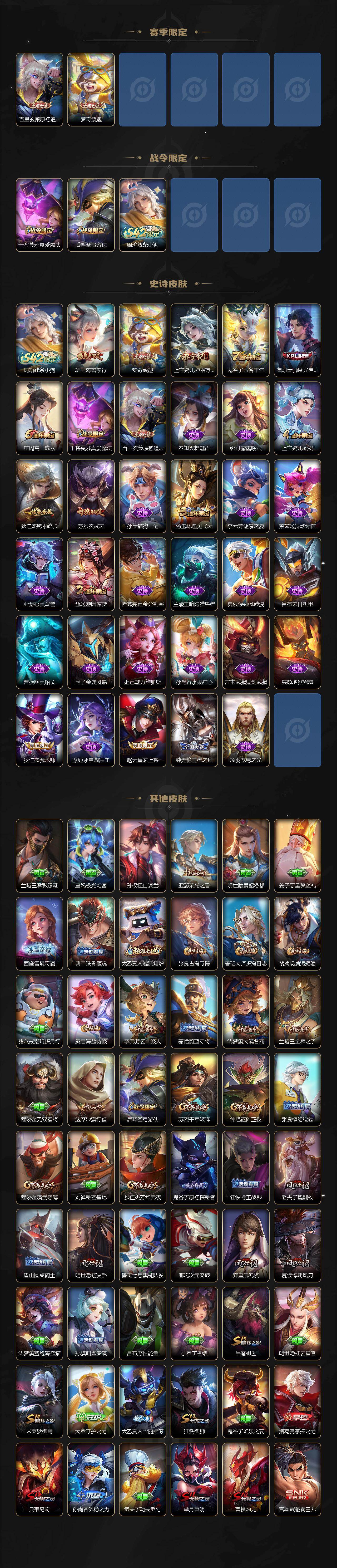 【赛季限定】:孙膑妖精王,扁鹊炼金王,虞姬凯尔特女王,白起狰,太乙真人饕餮,曹操烛龙,芈月重明,典韦穷奇,狂铁御狮,米莱狄御霄,牛魔御旌,夏侯惇朔风刀,弈星混沌棋,明世隐疑决卦,老夫子醍醐杖,鬼谷子原初探秘者,狄仁杰万华元夜,程咬金演武夺筹,钟馗驱傩正仪,苏烈千军破阵,达摩沙漠行僧,兰陵王金庭之子,沈梦溪大漠名商,李元芳云中旅人,桑启海盐诗旅,裴擒虎擒涛扼浪,鲁班大师探海日志,张良古海寻踪,太乙真人谧流熔炉,亚瑟荣光之誓,百里玄策原初追逐者,梦奇顽趣