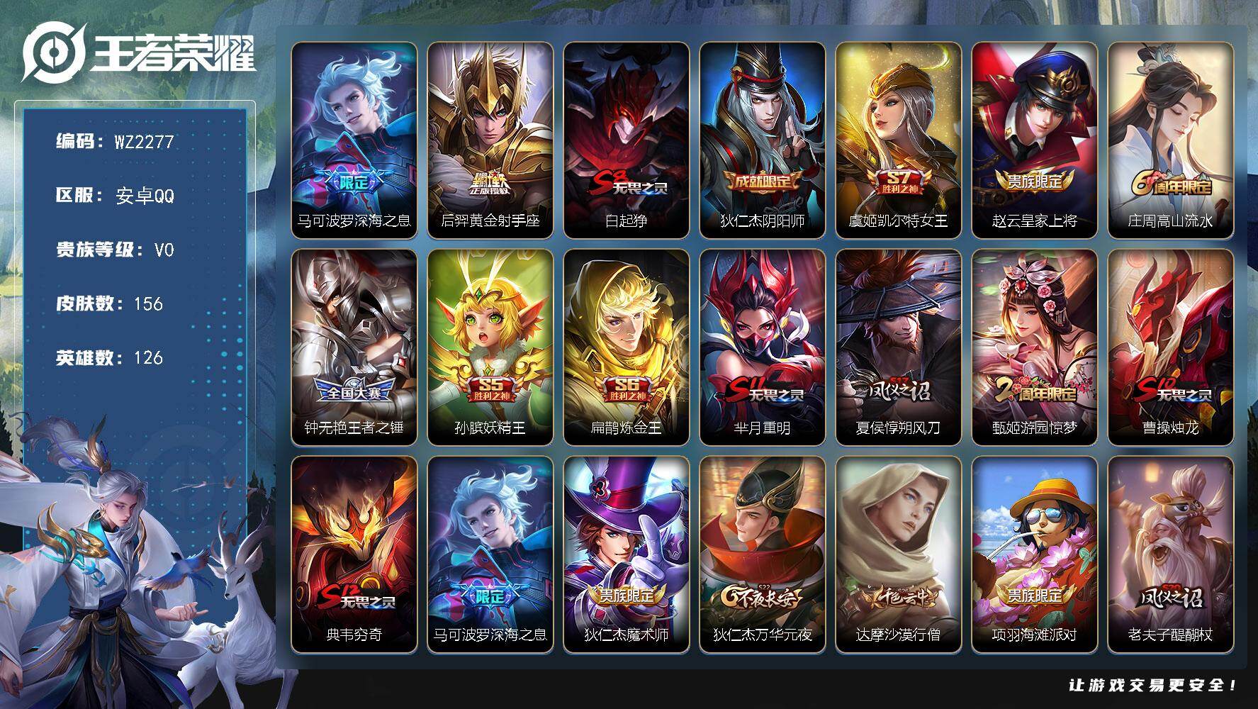 [17733730]安卓Q-156皮肤-2传说-34史诗 【英雄全皮】:孙权全皮 【传说皮肤】:马可波罗深海之息,后羿黄金射手座 【限定皮肤】:白起狰,狄仁杰阴阳师,虞姬凯尔特女王,赵云皇家上将,庄周高山流水,钟无艳王者之锤,孙膑妖精王,扁鹊炼金王,芈月重明,夏侯惇朔风刀,甄姬游园惊梦,曹操烛龙,典韦穷奇,马可波罗深海之息,狄仁杰魔术师,狄仁杰万华元夜,达摩沙漠行僧,项羽海滩派对,老夫子醍醐杖,程咬金演武夺筹,兰陵王金庭之子,牛魔御旌,后羿圣弓游侠,李元芳云中旅人,钟馗驱傩正仪,杨玉环遇见飞天,干将莫邪真爱魔法,太乙真人饕餮,太乙真人华丽摇滚,鬼谷子原初探秘者,鬼谷子五谷丰年,苏烈玄武志,苏烈千军破阵,百里玄策原初追逐者,弈星混沌棋,梦奇顽趣,沈梦溪大漠名商,明世隐疑决卦,裴擒虎擒涛扼浪,狂铁御狮,米莱狄御霄,瑶山海碧波行,上官婉儿梁祝,上官婉儿神器万象笔,鲁班大师匿光启智者,鲁班大师探海日志,桑启海盐诗旅,艾琳女武神,张良古海寻踪 【年限皮肤】:苏烈玄武志,瑶山海碧波行 【赛季限定】:孙膑妖精王,扁鹊炼金王,虞姬凯尔特女王,白起狰,太乙真人饕餮,曹操烛龙,芈月重明,典韦穷奇,狂铁御狮,米莱狄御霄,牛魔御旌,夏侯惇朔风刀,弈星混沌棋,明世隐疑决卦,老夫子醍醐杖,鬼谷子原初探秘者,狄仁杰万华元夜,程咬金演武夺筹,钟馗驱傩正仪,苏烈千军破阵,达摩沙漠行僧,兰陵王金庭之子,沈梦溪大漠名商,李元芳云中旅人,桑启海盐诗旅,裴擒虎擒涛扼浪,鲁班大师探海日志,张良古海寻踪,太乙真人谧流熔炉,亚瑟荣光之誓,百里玄策原初追逐者,梦奇顽趣 【战令限定】:干将莫邪真爱魔法,后羿圣弓游侠,周瑜线条小狗 【史诗皮肤】:周瑜线条小狗,瑶山海碧波行,梦奇顽趣,上官婉儿神器万象笔,鬼谷子五谷丰年,鲁班大师匿光启智者,庄周高山流水,干将莫邪真爱魔法,百里玄策原初追逐者,不知火舞魅语,娜可露露晚萤,上官婉儿梁祝,狄仁杰鹰眼统帅,苏烈玄武志,孙策猫狗日记,杨玉环遇见飞天,李元芳逐浪之夏,蔡文姬舞动绿茵,亚瑟心灵战警,甄姬游园惊梦,诸葛亮黄金分割率,兰陵王暗隐猎兽者,夏侯惇乘风破浪,吕布末日机甲,曹操幽灵船长,墨子金属风暴,妲己魅力维加斯,孙尚香水果甜心,宫本武藏鬼剑武藏,廉颇地狱岩魂,狄仁杰魔术师,甄姬冰雪圆舞曲,赵云皇家上将,钟无艳王者之锤,项羽苍穹之光 【其他皮肤】:兰陵王雾影缉谜,蚩奼极光幻客,孙权径山谋武,亚瑟荣
