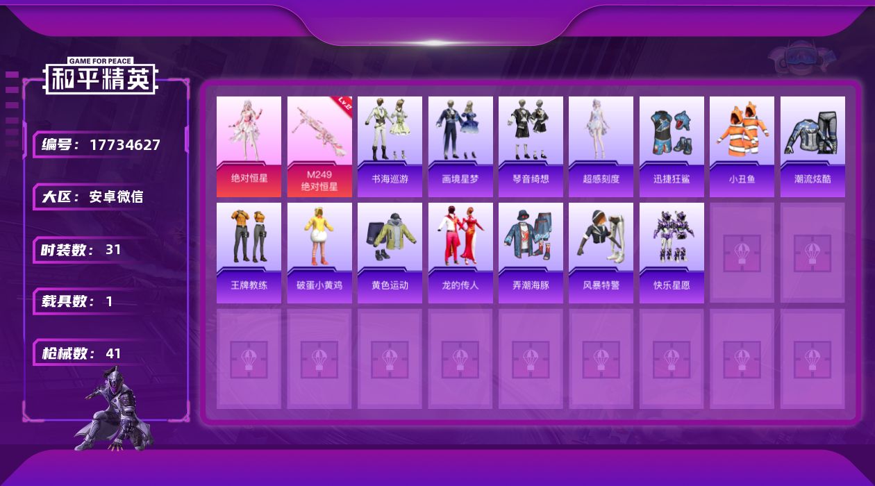 [17734627]【店主推荐捡漏号!可直接换绑】安卓 微信-2粉装-4特效枪-1载具-2粉色飞行器-13288热力值-2王牌印记-31套装-41枪皮【热门品类】:套装-小丑鱼【粉色套装】:角色-绝对恒星,角色-烬夜之誓【粉色枪皮等级】:ACE32-萌骑漫游(四级),AKS-74U-森灵之息(五级),Mk14-福马献瑞(五级),M249-绝对恒星(二级)【粉色载具】:霜月冰狼【粉色枪皮】:ACE32-萌骑漫游,AKS-74U-森灵之息,Mk14-福马献瑞,M249-绝对恒星