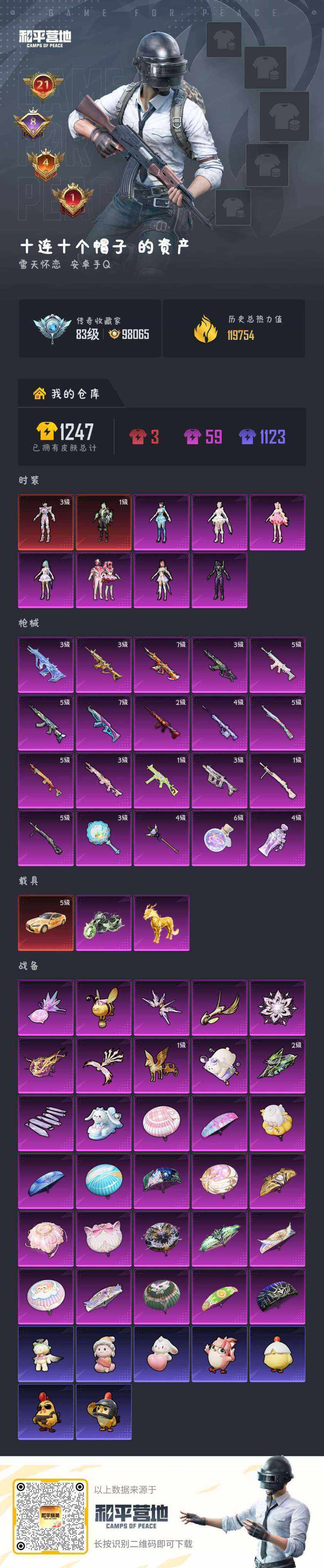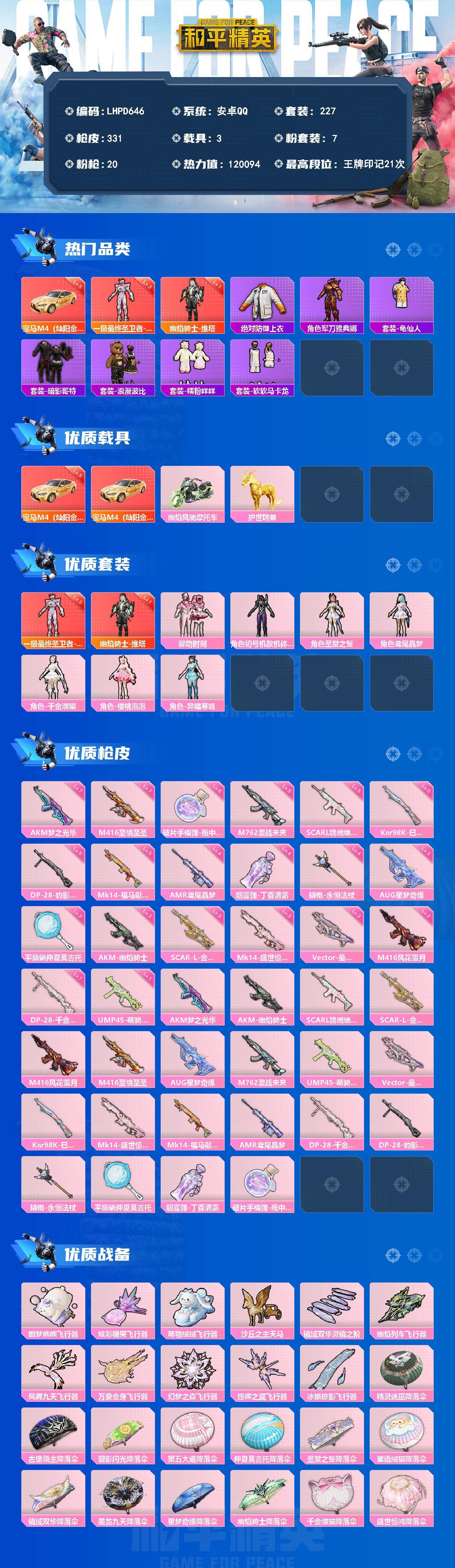 - [15612986]【特价出售/店主推荐】安卓 手Q-1神装-7粉装-4特效枪-5载具-2粉色飞行器-53291热力值-6王牌印记-118套装-157枪皮 【红色神装等级】:暮色玫影-艾丽娅(一级) 【红色角色神装】:暮色玫影-艾丽娅 【热门品类】:角色-军刀雅典娜 【粉色套装】:粉装-蝶舞迷情,粉装-星之彼岸,粉装-枪炮玫瑰,粉装-蜜桃特工,粉装-蝶舞蔷薇,粉装-精灵娃娃,角色-萨利娅 【粉色枪皮等级】:SCAR-L-梦幻火箭(七级),Kar98K-巳巳如意(五级),M249-彩虹甜喵(一级),DP-28-豹影疾电(五级) 【粉色载具】:兰博基尼Estoque(银翼灰),玛莎拉蒂MC20(星石白),宝马X6 M(曼岛绿),海龙奔腾,暮色幽蹄 【粉色枪皮】:SCAR-L-梦幻火箭,Kar98K-巳巳如意,M249-彩虹甜喵,DP-28-豹影疾电 【粉色飞行器】:甜蜜誓约飞行器,暮色之舞飞行器 【粉色降落伞】:春暖花开降落伞,甜蜜誓约降落伞,枪炮玫瑰降落伞,蓝莓炮弹降落伞,绚金瑰梦降落伞,甜心娃娃降落伞,垂柳戏鸭降落伞,鬼刀降落伞,暮色玫影降落伞,流光夜莺降落伞 【稀有套装】:套装-巳巳如意,套装-雪国风尚,套装-糖糖葫芦,套装-青团波波,角色-光矢逐梦,套装-燕燕于飞,套装-鱼渊荷华,角色-海琴烟,套装-紫幽梦,套装-蓝冰羽,套装-云朵鹅,套装-雪绒豹,套装-朱霞炽焰,套装-凌霄紫焰,玩偶服-懒羊羊,套装-书海巡游,套装-画境星梦,套装-琴音绮想 【稀有枪皮】:AKM-夜灯,AKM-彩虹符号,AKM-影袭,AKM-破晓战魂,AKM-霓虹街区,AKM-龙的传人,M16A4-幻世战舞者,SCAR-L-夜灯,SCAR-L-炫彩节奏,SCAR-L-玉兔迎春,SCAR-L-甜蜜誓约,SCAR-L-红色方程式,M416-糯团青竹,M416-红色方程式,M416-蓝色火焰,GROZA-异彩先驱,GROZA-影袭,GROZA-蓝莓炮弹,GROZA-暮色玫影,AUG-天降萌叽,AUG-灵符少年,QBZ-彩虹符号,QBZ-绚金瑰梦,M762-天降萌叽,M762-彩虹甜喵,M762-彩虹符号,M762-瑞龙福将,M762-云朵鹅,AC-VAL-天降萌叽,蜜獾-垂柳戏鸭,蜜獾-娇憨猪猪,ACE32-画境星梦,ARX-凌霄紫焰,UZI-啾咪啾咪,UZI-娇憨猪猪,UZI-月影灵韵,UMP45-春暖花开,UMP