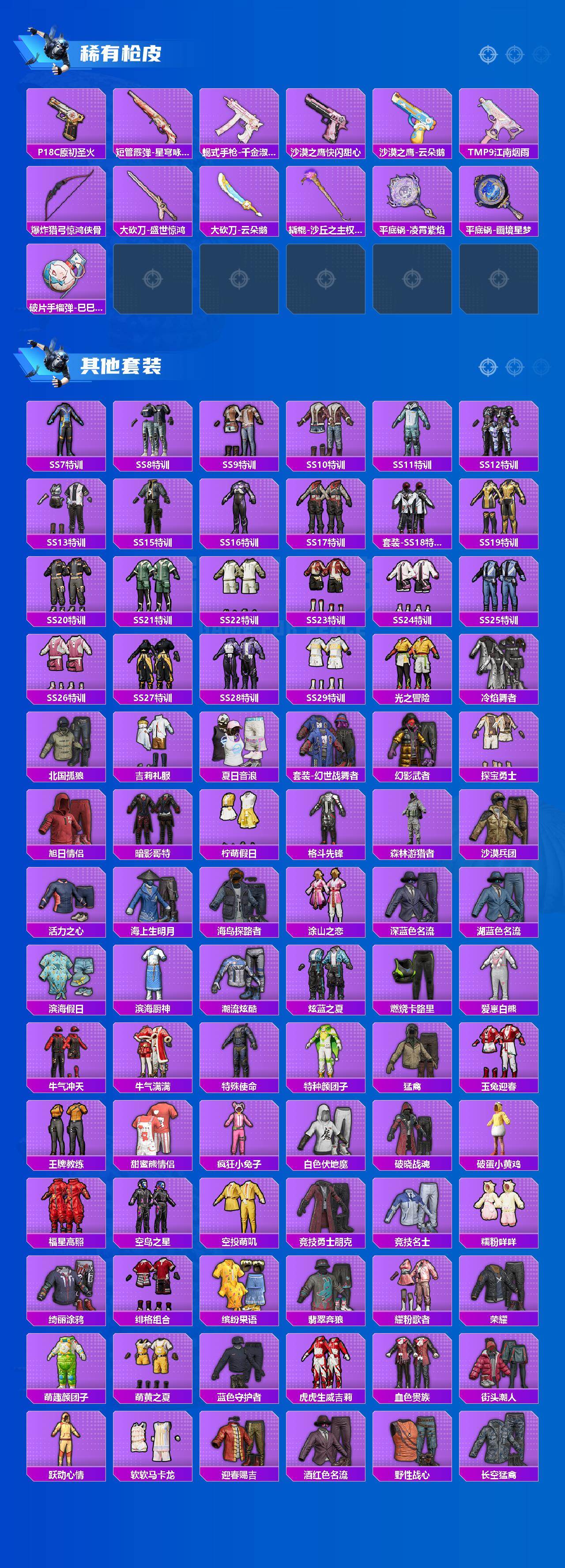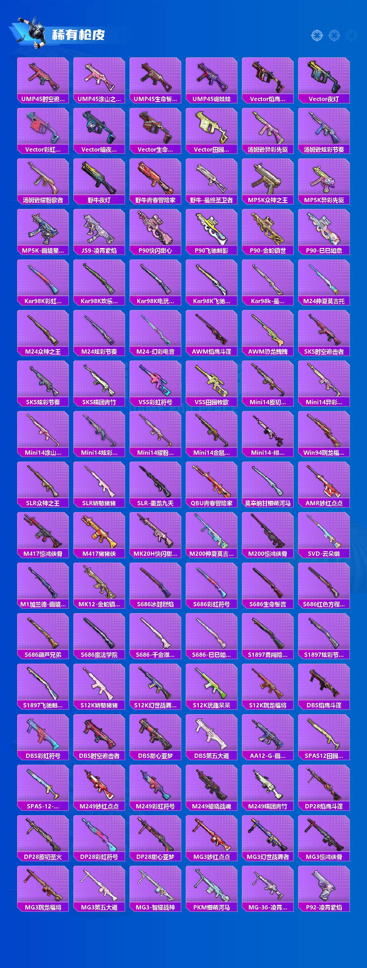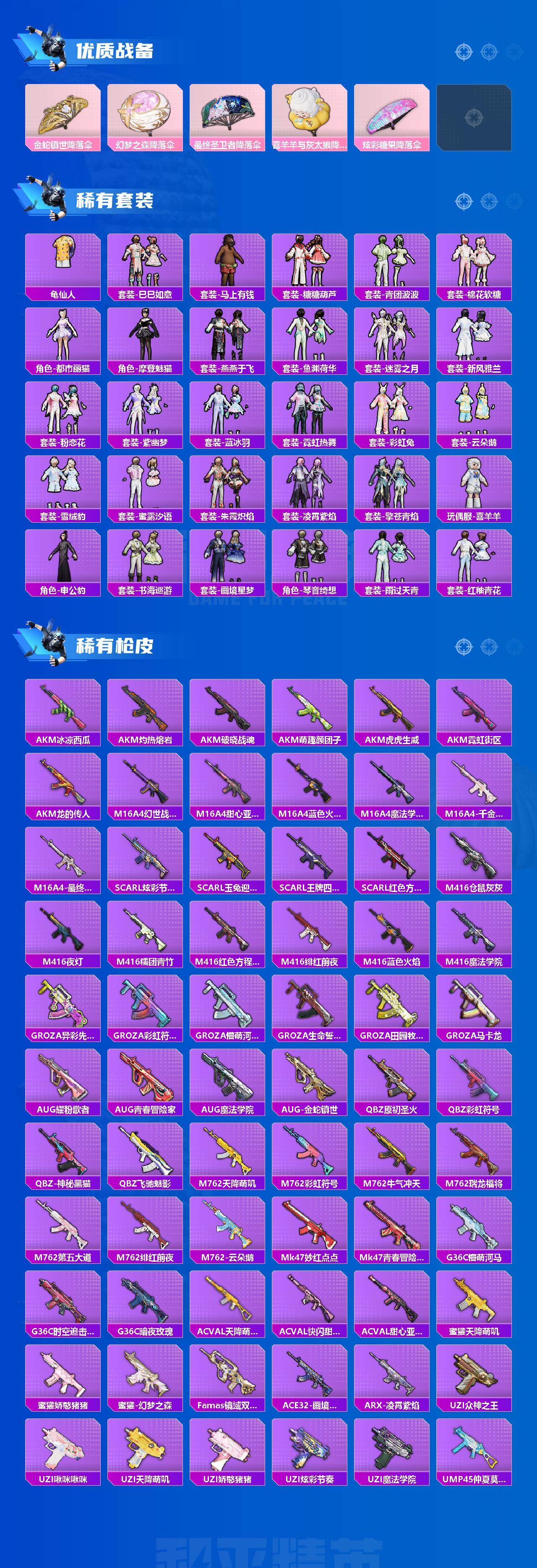 AKM-梦之光华,AKM-幽焰骑士,SCAR-L-锦绣绵绵,SCAR-L-金蛇镇世,M416-风花雪月,M416-至情至圣,AUG-星梦奇缘,M762-激战未来,Kar98K-巳巳如意,Mk14-盛世惊鸿,AMR-鸢尾晶梦,DP-28-千金淑猫,平底锅-仲夏莫吉托,烟雾弹-丁香清露