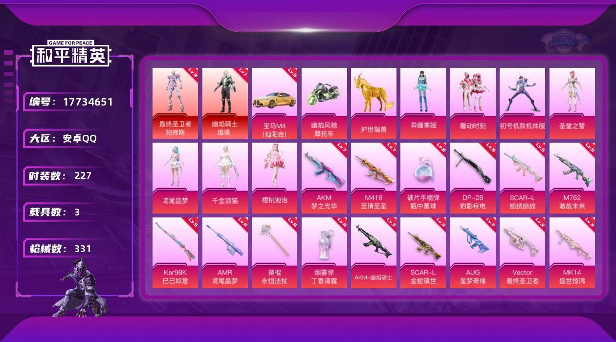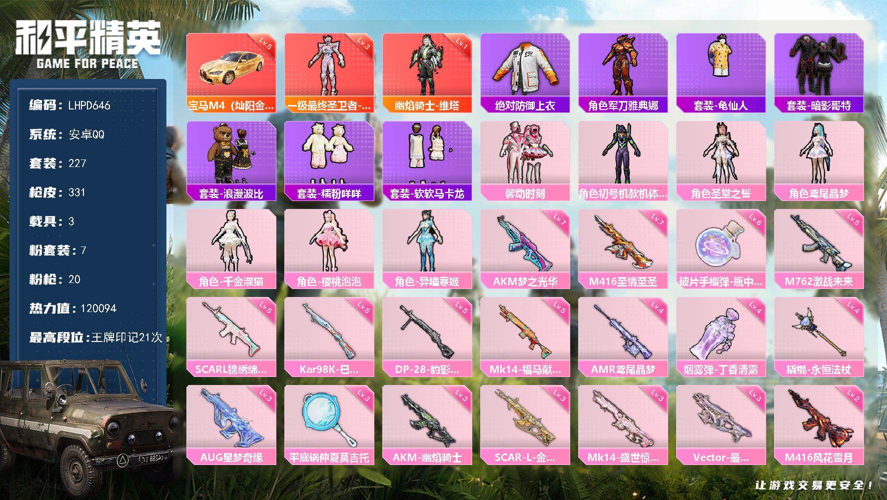 [17734651]【店主推荐捡漏号!可直接换绑】安卓 手Q-2神装-7粉装-20特效枪-3载具-13粉色飞行器-120094热力值-21王牌印记-227套装-331枪皮【红色载具】:宝马M4(灿阳金)(五级)【红色神装等级】:最终圣卫者-帕修斯(三级),幽焰骑士-维塔(一级)【红色角色神装】:最终圣卫者-帕修斯,幽焰骑士-维塔【热门品类】:绝对防御上衣,角色-军刀雅典娜,套装-龟仙人,套装-暗影哥特,套装-浪漫波比,套装-糯粉咩咩,套装-软软马卡龙【粉色套装】:粉装-馨动时刻,角色-初号机款机体服,角色-圣堂之誓,角色-鸢尾晶梦,角色-千金淑猫,角色-樱桃泡泡,角色-异瞳寒姬【粉色枪皮等级】:AKM-梦之光华(七级),AKM-幽焰骑士(三级),SCAR-L-锦绣绵绵(五级),SCAR-L-金蛇镇世(三级),M416-风花雪月(二级),M416-至情至圣(七级),AUG-星梦奇缘(三级),M762-激战未来(五级),UMP45-萌骑冒险(一级),Vector-最终圣卫者(三级),Kar98K-巳巳如意(五级),Mk14-盛世惊鸿(三级),Mk14-福马献瑞(五级),AMR-鸢尾晶梦(四级),DP-28-千金淑猫(一级),DP-28-豹影疾电(五级),撬棍-永恒法杖(四级),平底锅-仲夏莫吉托(三级),烟雾弹-丁香清露(四级),破片手榴弹-瓶中星球(六级)【粉色载具】:宝马M4(灿阳金),幽焰风驰摩托车,护世瑞兽【粉色枪皮】:AKM-梦之光华,AKM-幽焰骑士,SCAR-L-锦绣绵绵,SCAR-L-金蛇镇世,M416-风花雪月,M416-至情至圣,AUG-星梦奇缘,M762-激战未来,UMP45-萌骑冒险,Vector-最终圣卫者,Kar98K-巳巳如意,Mk14-盛世惊鸿,Mk14-福马献瑞,AMR-鸢尾晶梦,DP-28-千金淑猫,DP-28-豹影疾电,撬棍-永恒法杖,平底锅-仲夏莫吉托,烟雾弹-丁香清露,破片手榴弹-瓶中星球