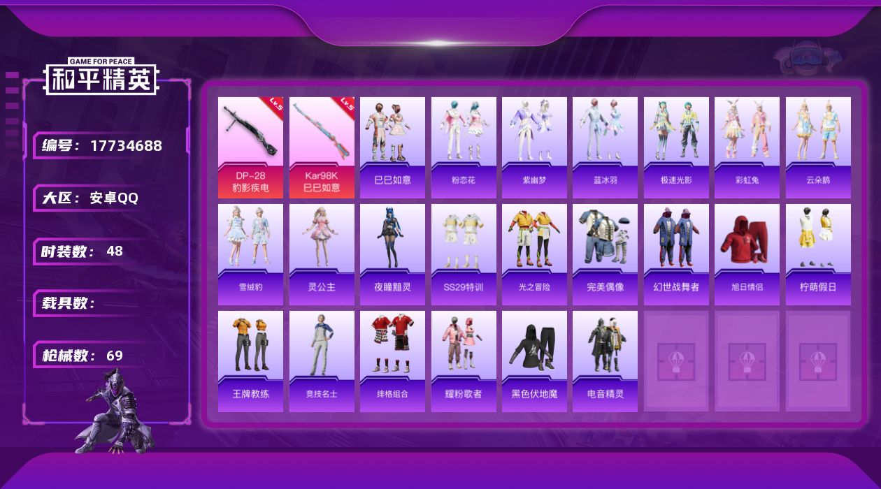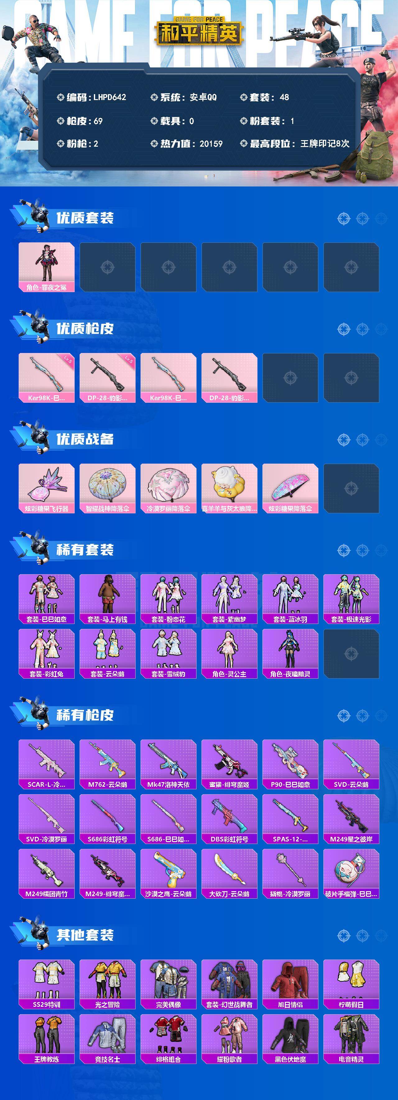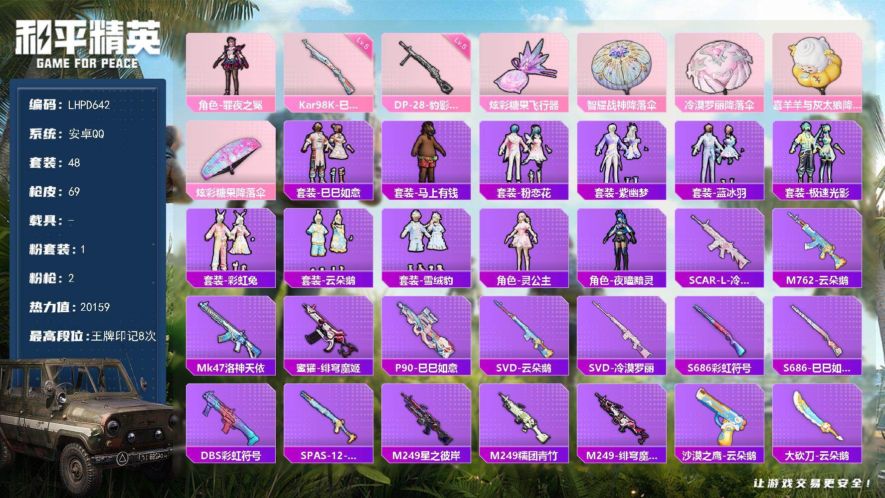 [17734688]【店主推荐捡漏号!可直接换绑】安卓 手Q-1粉装-2特效枪-0载具-1粉色飞行器-20159热力值-8王牌印记-48套装-69枪皮【粉色套装】:角色-罪夜之冕【粉色枪皮等级】:Kar98K-巳巳如意(五级),DP-28-豹影疾电(五级)【粉色枪皮】:Kar98K-巳巳如意,DP-28-豹影疾电【粉色飞行器】:炫彩糖果飞行器