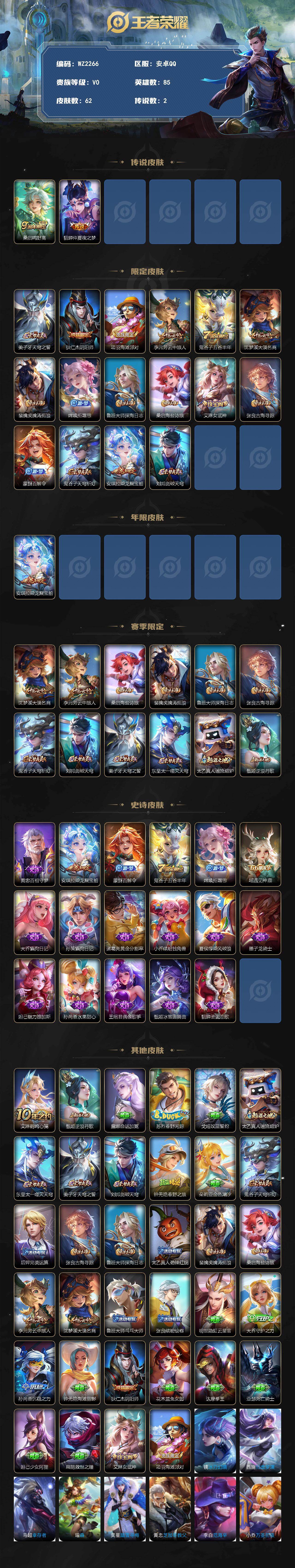 - [12183489]【商品标题】:安卓Q-V8-尊贵铂金I段位-125英雄-287皮肤-2典藏-0珍品无双-0无双-1珍品传说-13传说-89史诗 【荣耀典藏】:孙悟空全息碎影,李白鸣剑曳影 【珍品传说】:孙策时之奇旅 【内测皮肤】:狂铁特工战影,干将莫邪胡桃夹子 【传说皮肤】:宫本武藏地狱之眼,刘备时之恋人,李信一念神魔,曜云鹰飞将,虞姬启明星使,镜炽阳神光,澜逐花归海,马超琥珀纪元,孙策乘龙淬吴钩,夏侯惇霜北刀,桑启鸣野蒿,云缨幻光神枪,司空震愿照山河定 【限定皮肤】:夏侯惇霜北刀,蔡文姬夏日便利店,大乔绒语心约,虞姬夏日便利店,姜子牙天穹之誓,杨戬破阵退雄兵,狄仁杰阴阳师,赵云皇家上将,高渐离死亡摇滚,扁鹊奇幻香踪,芈月幻夜卜梦,元歌无心,夏侯惇朔风刀,典韦蓝屏警告,典韦岱宗,马可波罗暗影游猎,狄仁杰魔术师,狄仁杰万华元夜,达摩沙漠行僧,项羽海滩派对,老夫子醍醐杖,程咬金演武夺筹,韩信飞衡,王昭君午后时光,兰陵王金庭之子,亚瑟潮玩骑士王,孙悟空至尊宝,孙悟空孙行者,刘备百相守梦,李元芳银河之约,李元芳云中旅人,虞姬启明星使,钟馗驱傩正仪,杨戬潮玩骑兵,干将莫邪胡桃夹子,干将莫邪真爱魔法,雅典娜黎明之约,蔡文姬繁星吟游,鬼谷子五谷丰年,黄忠火炮绅士,苏烈千军破阵,百里玄策原初追逐者,梦奇顽趣,沈梦溪大漠名商,裴擒虎李小龙,裴擒虎擒涛扼浪,狂铁电玩高手,米莱狄御霄,云中君纤云弄巧,盾山御銮,嫦娥拒霜思,嫦娥暖冬兔眠,鲁班大师探海日志,桑启海盐诗旅,暃星界游侠,艾琳流音漫舞,赵怀真鹤归松栖,司空震地狱燃心,阿古朵江河有灵,张良古海寻踪,蒙犽百解令,蒙恬荣光圣徽,鬼谷子天穹祈灯,伽罗琥珀纪元,马超琥珀纪元,姬小满妄想食味,孙策乘龙淬吴钩,沈梦溪龙舞盛年,鲁班七号蔬乡物语,李元芳蔬乡物语,刘邦剑破天穹,上官婉儿群星魔术团,程咬金群星魔术团,镜青焰无极,项羽苍威无极,海诺心动手记,刘备异域游侠,芈月浮光幕影,周瑜熔金海岸 【年限皮肤】:韩信飞衡,典韦岱宗,孙策乘龙淬吴钩 【赛季限定】:夏侯惇朔风刀,狄仁杰万华元夜,达摩沙漠行僧,老夫子醍醐杖,程咬金演武夺筹,兰陵王金庭之子,张良古海寻踪,李元芳云中旅人,钟馗驱傩正仪,雅典娜黎明之约,苏烈千军破阵,百里玄策原初追逐者,梦奇顽趣,沈梦溪大漠名商,裴擒虎擒涛扼浪,米莱狄御霄,盾山御銮,鲁班大师探海日志,桑启海盐诗旅,鬼谷子天穹祈灯,蒙恬荣光圣徽,