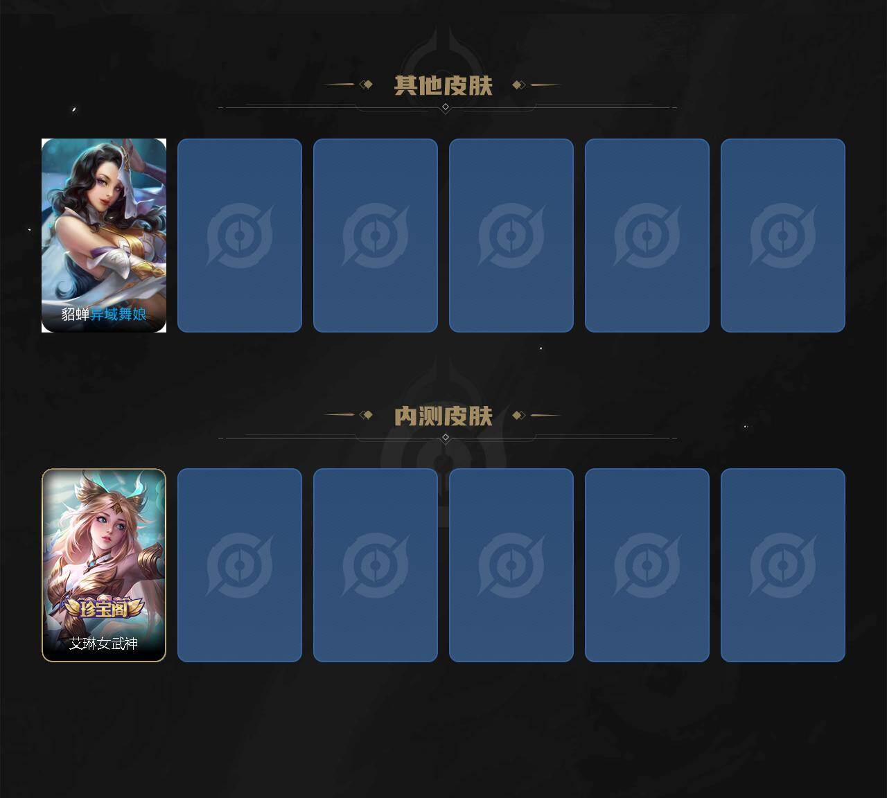 【赛季限定】:沈梦溪大漠名商,李元芳云中旅人,桑启海盐诗旅,裴擒虎擒涛扼浪,鲁班大师探海日志,张良古海寻踪,鬼谷子天穹祈灯,刘邦剑破天穹,姜子牙天穹之誓,东皇太一噬灭天穹,太乙真人谧流熔炉,甄姬逆浪荇歌