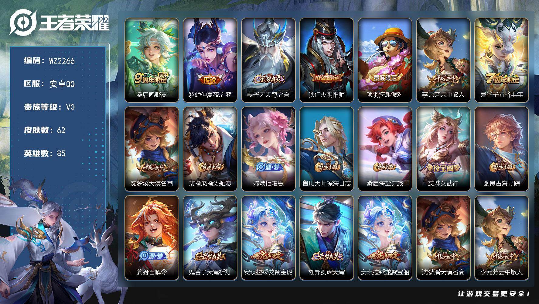 - [15754174]可二次【店主推荐捡漏号!可直接换绑】安卓Q-V6-最强王者段位-126英雄-321皮肤-1典藏皮肤-1珍品传说-8传说-88史诗 【英雄全皮】:刘禅全皮,钟无艳全皮,孙权全皮,影全皮 【荣耀典藏】:瑶拾光映像 【珍品传说】:孙策时之奇旅 【传说皮肤】:后羿神树通天,妲己愿照众生和,云缨幻光神枪,桑启鸣野蒿,孙尚香音你闪耀,镜炽阳神光,干将莫邪久胜战神,宫本武藏地狱之眼 【限定皮肤】:蒙犽顽岩魄,虞姬夏日便利店,姜子牙天穹之誓,杨戬破阵退雄兵,狄仁杰阴阳师,赵云皇家上将,墨子神迹守卫,高渐离死亡摇滚,高渐离玩趣恶龙,钟无艳王者之锤,钟无艳超时空战士,芈月幻夜卜梦,元歌云间偶戏,元歌无心,甄姬落雪兰心,马可波罗暗影游猎,狄仁杰魔术师,狄仁杰万华元夜,达摩沙漠行僧,项羽海滩派对,老夫子醍醐杖,老夫子航海奇遇记,程咬金演武夺筹,王昭君午后时光,兰陵王金庭之子,李元芳云中旅人,钟馗驱傩正仪,杨玉环遇见飞天,干将莫邪真爱魔法,鬼谷子原初探秘者,鬼谷子五谷丰年,黄忠火炮绅士,苏烈千军破阵,百里玄策原初追逐者,弈星混沌棋,梦奇天降福星,沈梦溪大漠名商,明世隐疑决卦,裴擒虎李小龙,裴擒虎擒涛扼浪,狂铁电玩高手,云中君纤云弄巧,盾山御銮,猪八戒西部大镖客,嫦娥拒霜思,鲁班大师探海日志,桑启海盐诗旅,艾琳流音漫舞,阿古朵江河有灵,张良古海寻踪,蒙犽百解令,蒙恬荣光圣徽,妲己灵卜魔法,鬼谷子天穹祈灯,姬小满妄想食味,安琪拉乘龙聚宝船,沈梦溪龙舞盛年,鲁班七号蔬乡物语,李元芳蔬乡物语,刘邦剑破天穹,程咬金群星魔术团,刘备异域游侠,周瑜熔金海岸 【年限皮肤】:安琪拉乘龙聚宝船 【赛季限定】:狄仁杰万华元夜,达摩沙漠行僧,老夫子醍醐杖,程咬金演武夺筹,兰陵王金庭之子,张良古海寻踪,李元芳云中旅人,钟馗驱傩正仪,鬼谷子原初探秘者,苏烈千军破阵,百里玄策原初追逐者,弈星混沌棋,沈梦溪大漠名商,明世隐疑决卦,裴擒虎擒涛扼浪,盾山御銮,鲁班大师探海日志,桑启海盐诗旅,鬼谷子天穹祈灯,蒙恬荣光圣徽,刘邦剑破天穹,姜子牙天穹之誓 【战令限定】:墨子神迹守卫,虞姬夏日便利店,钟无艳超时空战士,芈月幻夜卜梦,元歌云间偶戏,甄姬落雪兰心,马可波罗暗影游猎,老夫子航海奇遇记,王昭君午后时光,艾琳流音漫舞,干将莫邪真爱魔法,黄忠火炮绅士,狂铁电玩高手,猪八戒西部大镖客,妲己灵卜魔法,鲁班七号蔬乡物语,李元芳蔬乡物语