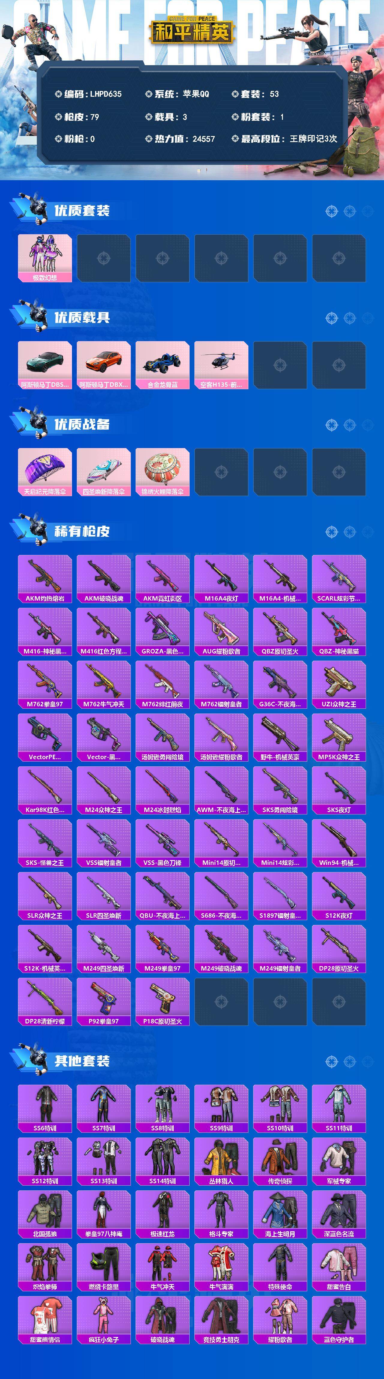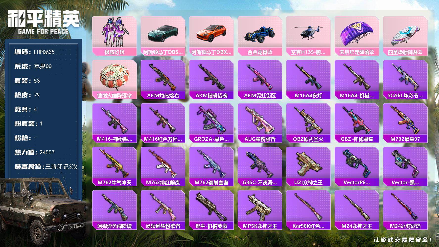 [17734722]【店主推荐捡漏号!可直接换绑】苹果 手Q-1粉装-0特效枪-4载具-0粉色飞行器-24557热力值-3王牌印记-53套装-79枪皮