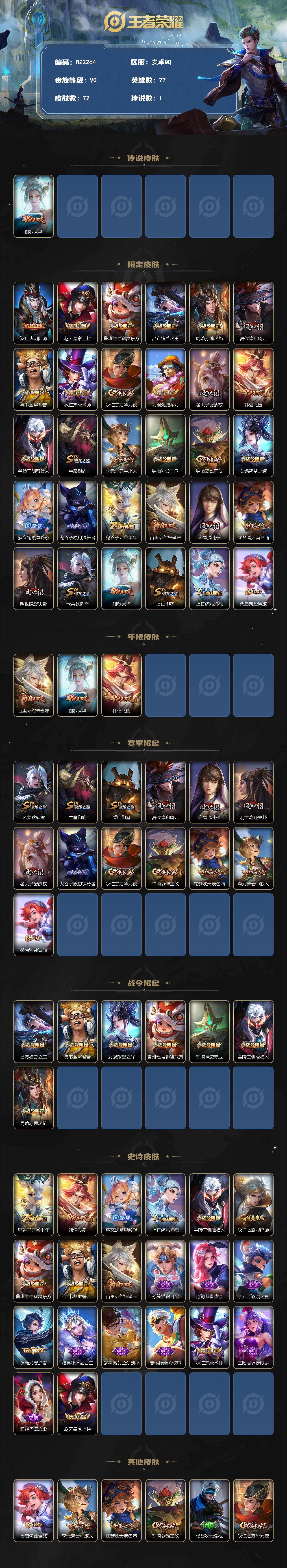 【限定皮肤】:狄仁杰阴阳师,赵云皇家上将,鲁班七号狮舞东方,吕布猎兽之王,周瑜赤莲之焰,夏侯惇朔风刀,典韦蓝屏警告,狄仁杰魔术师,狄仁杰万华元夜,项羽海滩派对,老夫子醍醐杖,韩信飞衡,兰陵王驯魔猎人,牛魔御旌,李元芳云中旅人,钟馗神迹守卫,钟馗驱傩正仪,女娲朔望之晖,蔡文姬繁星吟游,鬼谷子原初探秘者,鬼谷子五谷丰年,百里守约朱雀志,弈星混沌棋,沈梦溪大漠名商,明世隐疑决卦,米莱狄御霄,伽罗太华,盾山御銮,上官婉儿梁祝,桑启海盐诗旅