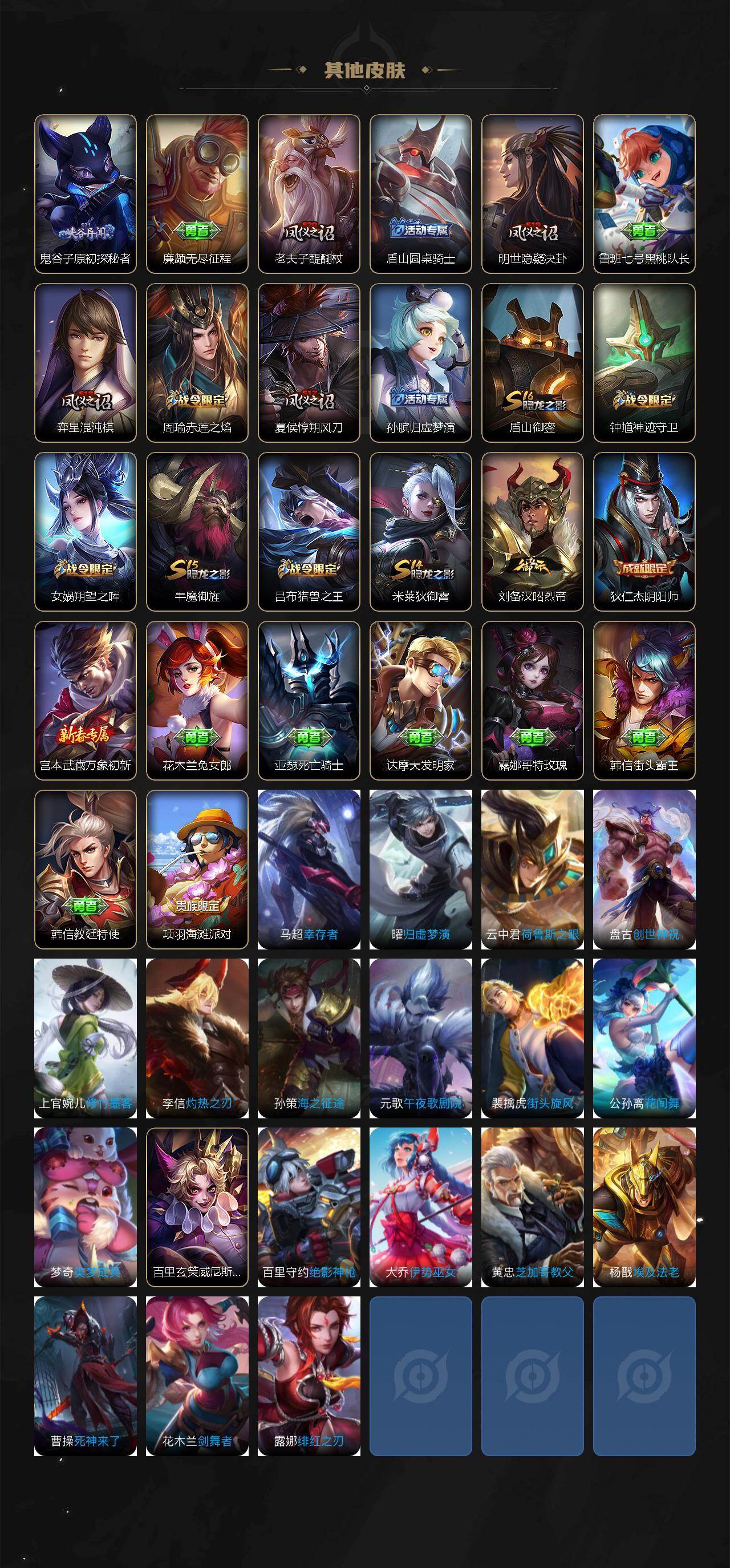 【其他皮肤】:桑启海盐诗旅,李元芳云中旅人,沈梦溪大漠名商,钟馗驱傩正仪,杨戬次元傲视,狄仁杰万华元夜,鬼谷子原初探秘者,廉颇无尽征程,老夫子醍醐杖,盾山圆桌骑士,明世隐疑决卦,鲁班七号黑桃队长,弈星混沌棋,周瑜赤莲之焰,夏侯惇朔风刀,孙膑归虚梦演,盾山御銮,钟馗神迹守卫,女娲朔望之晖,牛魔御旌,吕布猎兽之王,米莱狄御霄,刘备汉昭烈帝,狄仁杰阴阳师,宫本武藏万象初新,花木兰兔女郎,亚瑟死亡骑士,达摩大发明家,露娜哥特玫瑰,韩信街头霸王,韩信教廷特使,项羽海滩派对,马超幸存者,曜归虚梦演,云中君荷鲁斯之眼,盘古创世神祝,上官婉儿修竹墨客,李信灼热之刃,孙策海之征途,元歌午夜歌剧院,裴擒虎街头旋风,公孙离花间舞,梦奇美梦成真,百里玄策威尼斯狂欢,百里守约绝影神枪,大乔伊势巫女,黄忠芝加哥教父,杨戬埃及法老,曹操死神来了,花木兰剑舞者,露娜绯红之刃