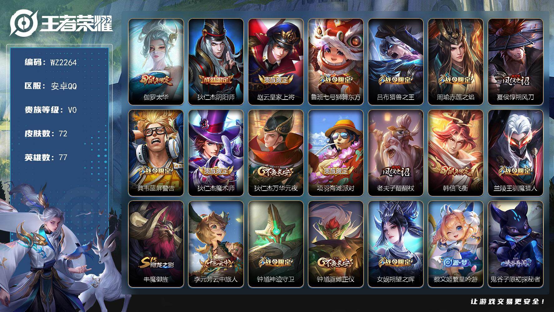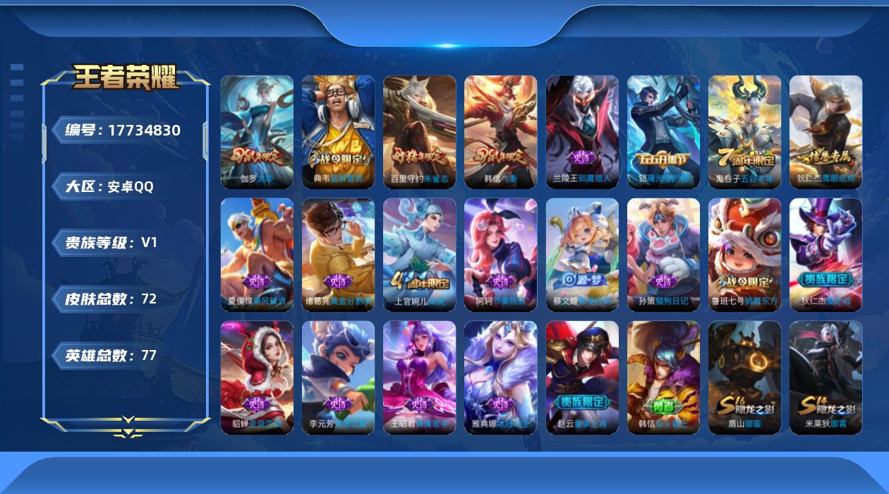 - [12929248]安卓Q-V4-永恒钻石III段位-124英雄-161皮肤-0典藏-0珍品无双-0无双-0珍品传说-8传说-45史诗 【内测皮肤】:嬴政优雅恋人,艾琳女武神,狂铁特工战影 【传说皮肤】:狄仁杰超时空战士,孙尚香末日机甲,后羿黄金射手座,赵云乘龙铭钟鼎,桑启鸣野蒿,云缨幻光神枪,澜愿照九州拓,女娲愿照千秋盛 【限定皮肤】:姜子牙天穹之誓,杨戬破阵退雄兵,李白谪仙醉月,狄仁杰阴阳师,赵云皇家上将,嬴政优雅恋人,庄周高山流水,狄仁杰魔术师,达摩沙漠行僧,项羽海滩派对,兰陵王金庭之子,李元芳云中旅人,钟馗驱傩正仪,杨玉环遇见飞天,雅典娜黎明之约,苏烈千军破阵,梦奇顽趣,沈梦溪大漠名商,裴擒虎擒涛扼浪,云中君纤云弄巧,猪八戒猪悟能,嫦娥拒霜思,鲁班大师探海日志,桑启海盐诗旅,艾琳女武神,阿古朵江河有灵,张良古海寻踪,蒙犽百解令,蒙恬荣光圣徽,鬼谷子天穹祈灯,伽罗琥珀纪元,赵云乘龙铭钟鼎,沈梦溪龙舞盛年,刘邦剑破天穹,上官婉儿群星魔术团,程咬金群星魔术团,周瑜熔金海岸 【年限皮肤】:赵云乘龙铭钟鼎 【赛季限定】:达摩沙漠行僧,兰陵王金庭之子,张良古海寻踪,李元芳云中旅人,钟馗驱傩正仪,雅典娜黎明之约,苏烈千军破阵,梦奇顽趣,沈梦溪大漠名商,裴擒虎擒涛扼浪,鲁班大师探海日志,桑启海盐诗旅,鬼谷子天穹祈灯,蒙恬荣光圣徽,刘邦剑破天穹,姜子牙天穹之誓 【史诗皮肤】:赵云皇家上将,赵云未来纪元,貂蝉圣诞恋歌,甄姬冰雪圆舞曲,狄仁杰魔术师,廉颇地狱岩魂,宫本武藏鬼剑武藏,孙尚香水果甜心,嬴政优雅恋人,妲己魅力维加斯,墨子金属风暴,吕布圣诞狂欢,曹操幽灵船长,花木兰水晶猎龙者,夏侯惇乘风破浪,兰陵王暗隐猎兽者,诸葛亮黄金分割率,百里守约特工魅影,铠曙光守护者,蔡文姬舞动绿茵,李元芳逐浪之夏,程咬金功夫厨神,白起星夜王子,阿轲节奏热浪,杨玉环遇见飞天,伽罗箭羽风息,狄仁杰鹰眼统帅,不知火舞魅语,云中君纤云弄巧,沈梦溪月团寄思,猪八戒猪悟能,庄周高山流水,嫦娥拒霜思,雅典娜黎明之约,梦奇顽趣,阿古朵江河有灵,蒙犽百解令,周瑜雪夜绮愿,蒙恬荣光圣徽,伽罗琥珀纪元,上官婉儿群星魔术团,李白谪仙醉月,牛魔星界战将,阿轲化蝶舞,后羿石田雨龙 【其他皮肤】:项羽海滩派对,韩信教廷特使,韩信街头霸王,达摩大发明家,赵云忍炎影,艾琳女武神,牛魔西部大镖客,扁鹊化身博士,宫本武藏未来纪元,孙膑天使之翼,妲己少