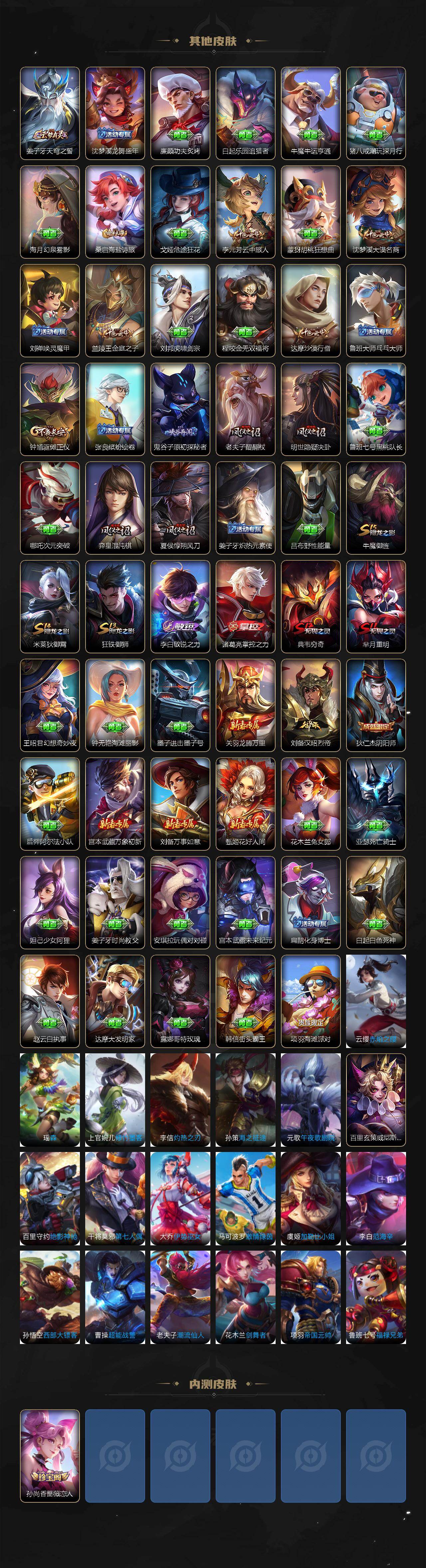 【赛季限定】:芈月重明,典韦穷奇,狂铁御狮,米莱狄御霄,牛魔御旌,夏侯惇朔风刀,弈星混沌棋,明世隐疑决卦,老夫子醍醐杖,鬼谷子原初探秘者,钟馗驱傩正仪,达摩沙漠行僧,兰陵王金庭之子,沈梦溪大漠名商,李元芳云中旅人,桑启海盐诗旅,姜子牙天穹之誓,东皇太一噬灭天穹,亚瑟荣光之誓