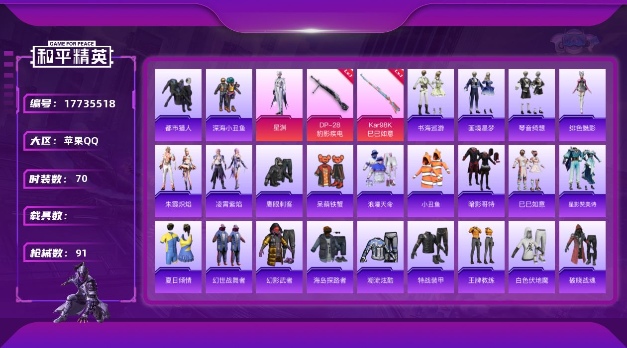 [17735518]【特价出售/店主推荐】苹果 手Q-1粉装-5特效枪-0载具-1粉色飞行器-25005热力值-2王牌印记-70套装-91枪皮 【热门品类】:套装-浪漫天命,套装-都市猎人,套装-深海小丑鱼,套装-小丑鱼,套装-暗影哥特 【粉色套装】:角色-星渊 【粉色枪皮等级】:UMP45-萌骑冒险(二级),AKS-74U-森灵之息(五级),Kar98K-巳巳如意(一级),Mk14-福马献瑞(五级),DP-28-豹影疾电(一级) 【粉色枪皮】:UMP45-萌骑冒险,AKS-74U-森灵之息,Kar98K-巳巳如意,Mk14-福马献瑞,DP-28-豹影疾电 【粉色飞行器】:炫彩糖果飞行器 【粉色降落伞】:绝对恒星降落伞,幻影战神降落伞,甜心宝贝降落伞,音爆索尼克降落伞,圣堂之誓降落伞,无垠阁降落伞,极意拳锋降落伞,炫彩糖果降落伞 【稀有套装】:套装-巳巳如意,套装-雪国风尚,套装-炫彩糖果,套装-马上有钱,套装-星影赞美诗,套装-朱霞炽焰,套装-凌霄紫焰,角色-绯色魅影,套装-书海巡游,套装-画境星梦,套装-琴音绮想,套装-雨过天青,套装-红釉青花 【稀有枪皮】:AUG-冰晶雪宝,AKM-影袭,AKM-缤纷海域,SCAR-L-夜灯,M416-糯团青竹,M416-蓝色火焰,GROZA-影袭,GROZA-暮色玫影,AUG-幻影战神,M762-天降萌叽,ACE32-画境星梦,ARX-凌霄紫焰,UZI-天降萌叽,UZI-幻影战神,UZI-影袭,UMP45-夜灯,Vector-生命誓言,汤姆逊-像素花束,野牛-沙丘之主,MP5K-画境星梦,JS9-凌霄紫焰,Kar98K-影袭,M24-影袭,SKS-迅猛狂鲨,Mini14-穿刺龙虾,AMR-喜羊羊与灰太狼,M1加兰德-画境星梦,S686-生命誓言,S12K-夜灯,S12K-幻影战神,S12K-极意拳锋,AA12-G-画境星梦,SPAS-12-钛晶裂爪,M249-星之彼岸,MG3-幻世战舞者,MG-36-凌霄紫焰,P92-凌霄紫焰,蝎式手枪-蛇蝎美人,撬棍-暮色玫影,平底锅-凌霄紫焰,平底锅-无垠阁,平底锅-画境星梦 【其他套装】:套装-夏日倾情,套装-幻世战舞者,套装-幻影武者,套装-暗影哥特,套装-浪漫天命,套装-海岛探路者,套装-潮流炫酷,套装-特战装甲,套装-王牌教练,套装-白色伏地魔,套装-破晓战魂,套装-破蛋小黄鸡,套装-竞技名士,套
