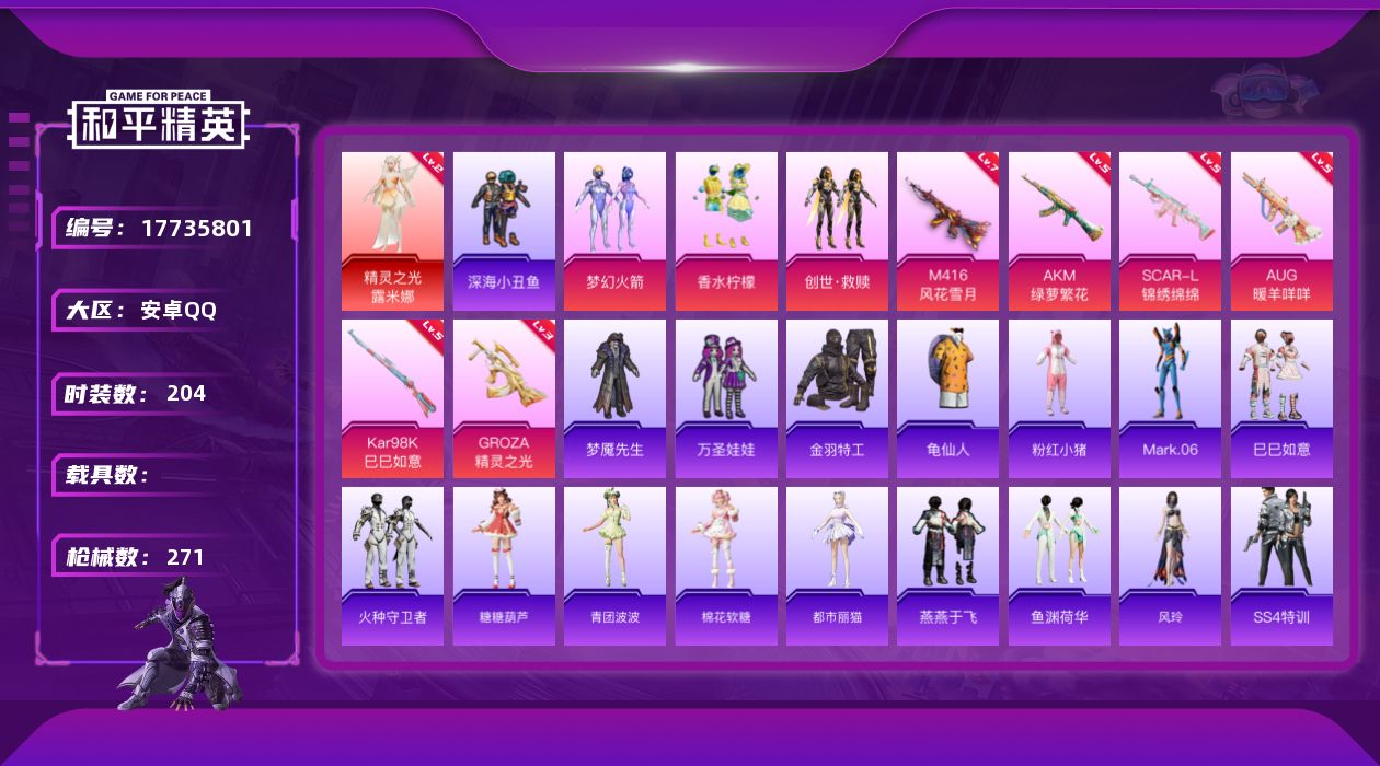 [17735801]可二次【特价出售/店主推荐】 安卓 手Q-1神装-3粉装-6特效枪-4粉色飞行器-86286热力值-17王牌印记-204套装-271枪皮【红色神装等级】:精灵之光-露米娜(二级)【热门品类】:粉装-梦幻火箭,套装-深海小丑鱼,套装-金羽特工,套装-龟仙人,套装-粉红小猪,角色-Mark.06【粉色套装】:粉装-梦幻火箭,粉装-香水柠檬,套装-创世·救赎【粉色枪皮等级】:AKM-绿萝繁花(五级),SCAR-L-锦绣绵绵(五级),M416-风花雪月(七级),GROZA-精灵之光(三级),AUG-暖羊咩咩(五级),Kar98K-巳巳如意(五级)【粉色枪皮】:AKM-绿萝繁花,SCAR-L-锦绣绵绵,M416-风花雪月,GROZA-精灵之光,AUG-暖羊咩咩,Kar98K-巳巳如意【粉色飞行器】:梦幻火箭飞行器,心之恋语飞行翼,天之羽翼飞行器,曦光华影飞行器