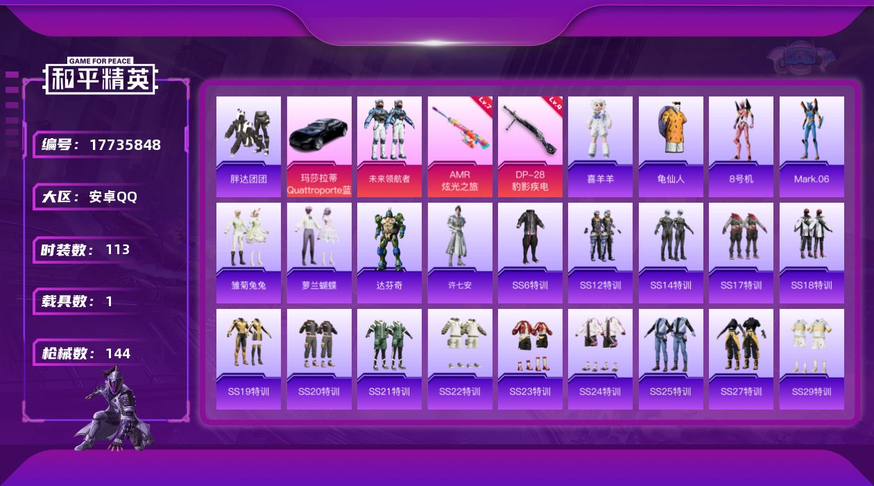 [17735848]可二次【特价出售/店主推荐】安卓 手Q-1粉装-4特效枪-1载具-43008热力值-6王牌印记-113套装-144枪皮【热门品类】:套装-胖达团团,套装-龟仙人,角色-8号机,角色-Mark.06【粉色套装】:粉装-未来领航者【粉色枪皮等级】:UMP45-萌骑冒险(四级),Mk14-福马献瑞(五级),AMR-炫光之旅(七级),DP-28-豹影疾电(四级)【粉色载具】:玛莎拉蒂Quattroporte(夜幕蓝)