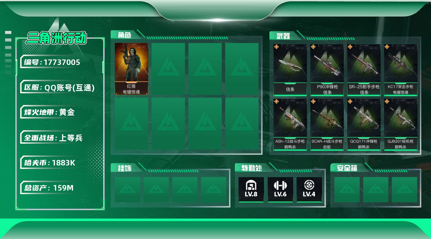 [17737005]【店主推荐捡漏号!可直接换绑】159m总资产-1883k哈伏币-60烽火等级-黄金-14战场等级-上等兵 【干员外观】:红狼-电锯惊魂 【近战皮肤】:近战-信条,近战-黑鹰 【传说外观】:ASh-12战斗步枪-鹅鸭杀,SCAR-H战斗步枪-启航,KC17突击步枪-电锯惊魂,P90冲锋枪-信条,勇士冲锋枪-能天使-午夜邮差,QCQ171冲锋枪-鹅鸭杀,QJB201轻机枪-鹅鸭杀,SR-25射手步枪-信条,R93狙击步枪-维什戴尔 【史诗外观】:MP5冲锋枪-战术竞备,Vector冲锋枪-阿萨拉文明 【稀有外观】:M4A1突击步枪-零点,AKM突击步枪-肃杀,QBZ95-1突击步枪-公平竞技,K416突击步枪-碳纤维,M7战斗步枪-捣蛋鬼,AK-12突击步枪-零点,SCAR-H战斗步枪-荣耀列队,腾龙突击步枪-冰天雪地,MP5冲锋枪-弄臣,P90冲锋枪-黄昏,Vector冲锋枪-先锋,UZI冲锋枪-亚特兰蒂斯,SMG-45-行动开启,SMG-45冲锋枪-幻影结构,勇士冲锋枪-冰天雪地,QJB201轻机枪-哈夫克卫队,Mini-14射手步枪-荣耀列队,SVD狙击步枪-战术行动,SR-25射手步枪-开拓,G18-星链科技,G18-哈夫克航天 【普通外观】:M4A1突击步枪-粉色涂装,M4A1突击步枪-高雅黑,M4A1突击步枪-海色,QBZ95-1突击步枪-海浪,QBZ95-1突击步枪-三角洲力量,QBZ95-1突击步枪-海色,K416突击步枪-几何迷彩,K416突击步枪-高雅黑,M16A4突击步枪-高雅黑,AUG突击步枪-浅蓝涂装,M7战斗步枪-红色涂装,SG552突击步枪-浅蓝涂装,SG552突击步枪-海浪,SCAR-H战斗步枪-红色涂装,SCAR-H战斗步枪-数码迷彩,G3战斗步枪-高雅黑,PTR-32突击步枪-黄蜂,MP5冲锋枪-安全工作,MP5冲锋枪-海色,MP5冲锋枪-黄蜂,Vector冲锋枪-几何迷彩,UZI冲锋枪-海色,野牛冲锋枪-高雅黑,QCQ171冲锋枪-三角洲力量,M1014霰弹枪-高雅黑,M1014霰弹枪-海浪,M249轻机枪-黄蜂,M250通用机枪-条纹,QJB201轻机枪-三角洲力量,SVD狙击步枪-高雅黑,SKS射手步枪-三角洲力量,SV-98狙击步枪-红色涂装,QSZ92G-条纹,沙漠之鹰-海浪,沙漠之鹰-高雅黑 【载具外观】:轮式突击炮-荣
