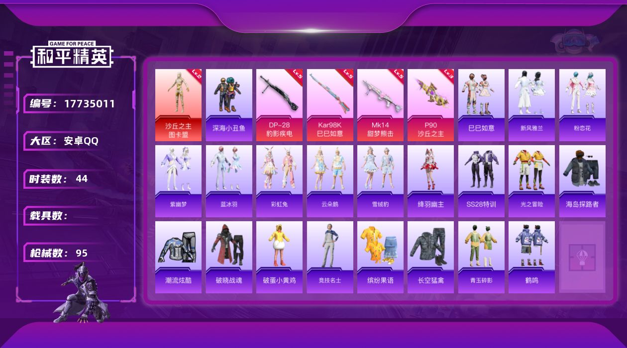 [17735011]可二次【特价出售/店主推荐】安卓 手Q-1神装-6特效枪-1粉色飞行器-23804热力值-2王牌印记-44套装-95枪皮【红色神装等级】:沙丘之主-图卡盟(二级)【热门品类】:套装-深海小丑鱼【粉色枪皮等级】:P90-沙丘之主(三级),Kar98K-巳巳如意(五级),Mk14-甜梦熊击(五级),Mk14-福马献瑞(二级),AA12-G-萌骑幻想(三级),DP-28-豹影疾电(五级) 【粉色枪皮】:P90-沙丘之主,Kar98K-巳巳如意,Mk14-甜梦熊击,Mk14-福马献瑞,AA12-G-萌骑幻想,DP-28-豹影疾电【粉色飞行器】:沙丘之主天马