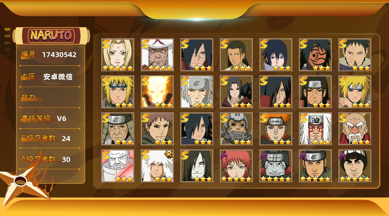 【S级忍者】:半藏「秽土转生」(3星),猿飞日斩「秽土转生」(3星),波风水门「秽土转生」(3星),千手扉间「秽土转生」(3星),千手柱间「秽土转生」(3星),宇智波鼬「秽土转生」(3星),宇智波斑「秽土转生」(3星),宇智波斑「秽土转生·解」(3星),宇智波带土「忍界大战」(3星),宇智波斑「木叶创立」(3星),千手柱间「木叶创立」(3星),罗砂「四代目风影」(3星),大野木「三代目土影」(3星),自来也「仙人模式」(3星),自来也「舞之豪杰」(3星),大蛇丸(3星),纲手(5星),猿飞日斩(4星),波风水门(3星),神秘面具男「红夜之刃」(3星),漩涡鸣人「九喇嘛连结」(3星),佩恩「天道」(3星),宇智波佐助「永恒万花筒」(3星),大筒木金式(3星)