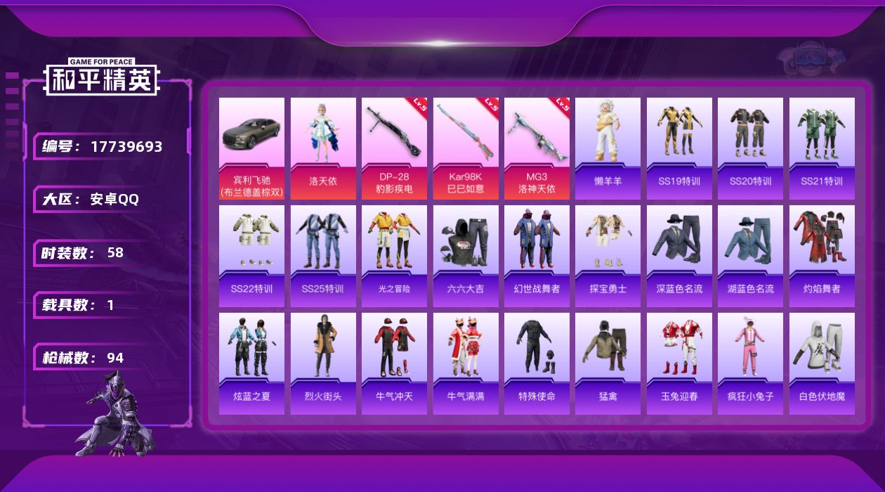 [17739693]安卓 手Q-1粉装-4特效枪-1载具-1粉色飞行器-23920热力值-2王牌印记-58套装-94枪皮【粉色套装】:角色-洛天依【粉色枪皮等级】:Kar98K-巳巳如意(五级),Mk14-福马献瑞(一级),DP-28-豹影疾电(五级),MG3-洛神天依(五级)【粉色载具】:宾利飞驰(布罗德盖棕双色)【粉色枪皮】:Kar98K-巳巳如意,Mk14-福马献瑞,DP-28-豹影疾电,MG3-洛神天依【粉色飞行器】:炫彩糖果飞行器