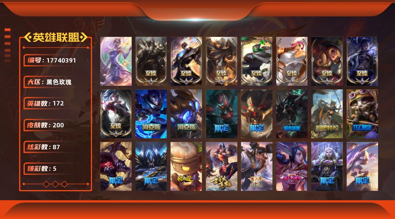 [17740391]未定级段位-172英雄-200皮肤-87炫彩-1终极-11神话-40限定-22传说-25史诗