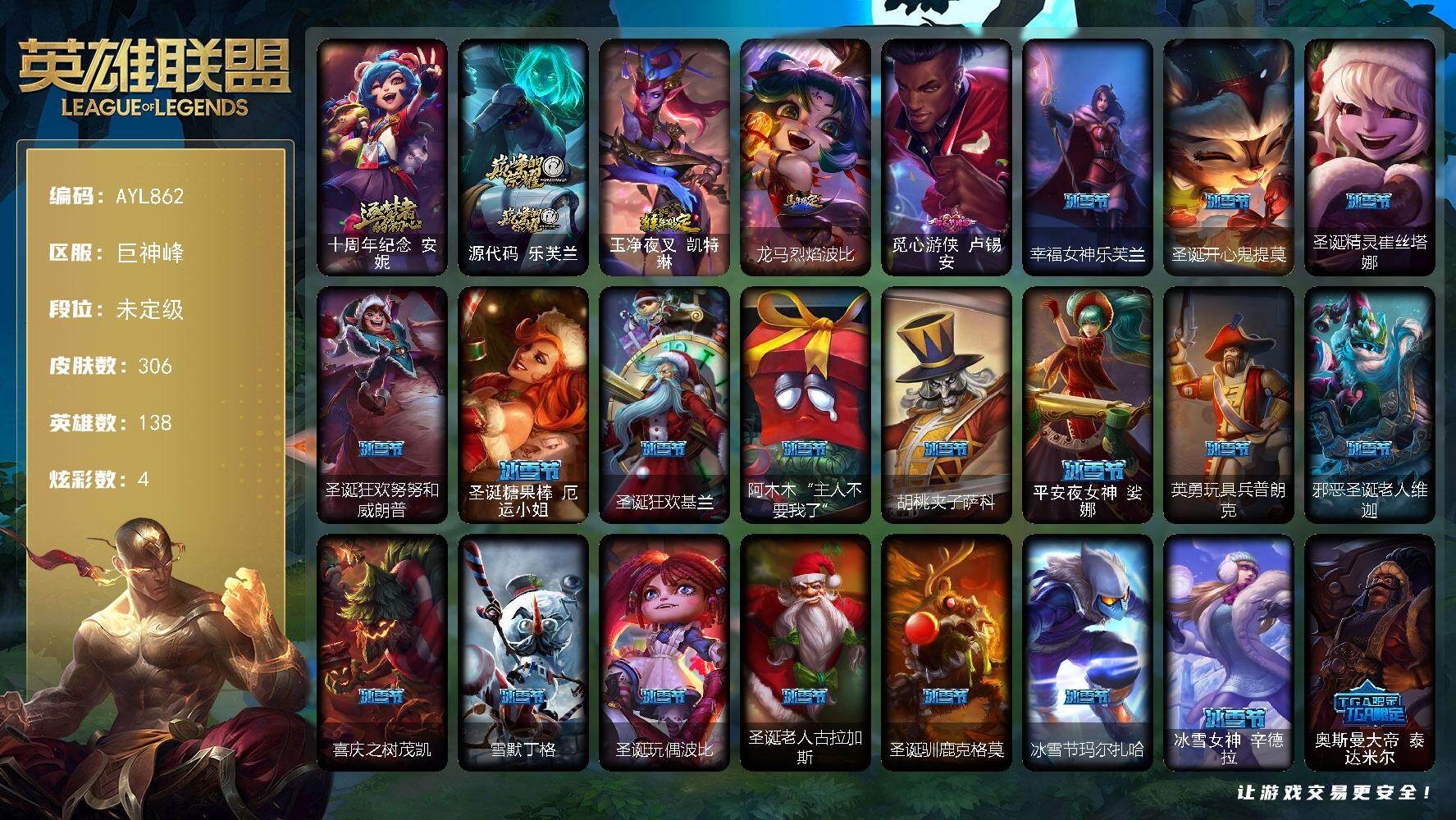 [17743375]未定级段位-138英雄-306皮肤-4炫彩-0终极-2神话-51限定-25传说-88史诗 【神话皮肤】:十周年纪念安妮,源代码乐芙兰 【年限皮肤】:玉净夜叉凯特琳,龙马烈焰波比 【情人节限定】:觅心游侠卢锡安 【冰雪限定】:幸福女神乐芙兰,圣诞开心鬼提莫,圣诞精灵崔丝塔娜,圣诞狂欢努努和威朗普,圣诞糖果棒厄运小姐,圣诞狂欢基兰,阿木木“主人不要我了”,胡桃夹子萨科,平安夜女神娑娜,英勇玩具兵普朗克,邪恶圣诞老人维迦,喜庆之树茂凯,雪默丁格,圣诞玩偶波比,圣诞老人古拉加斯,圣诞驯鹿克格莫,冰雪节玛尔扎哈,冰雪女神辛德拉 【限定皮肤】:奥斯曼大帝泰达米尔,卧虎藏龙贾克斯,诺斯费拉图弗拉基米尔,冠军典狱长锤石,冠军之血希瓦娜,暗杀星蒙多,暗杀星努努和威朗普,暗杀星慎,SKTT1劫,SKTT1婕拉,SSW辛吉德,海贼瑞兹,南瓜头费德提克,鬼影重重魔腾,鬼影森森茂凯,无头骑士赫卡里姆,糖果使徒费德提克,泳池派对蕾欧娜,泳池派对李青,机械迷城加里奥,密林猎手提莫,女猎手希维尔,外星装甲库奇,创战纪希维尔,勇者阿狸,都铎王朝图奇,钢铁之翼艾尼维亚,红桃杰克崔斯特,防暴天使凯尔,警用试作体K9内瑟斯 【传说皮肤】:魔幻卡牌崔斯特,源计划林易,恶魔男爵瑞兹,霸天零式赛恩,提莫约德尔人的一大步,约德尔国队长提莫,女皇艾希,战地巨兽科加斯,双重冰晶艾尼维亚,电玩女神娑娜,女主播迦娜,红色男爵库奇,最终BOSS维迦,陆地王者4WD布里茨,苹果机器人布里茨,冰川巨兽墨菲特,上古战魂魔腾,第三类接触黑默丁格,炼狱魔犬内瑟斯,腥红之月鬼武姬阿卡丽,焰尾妖狐阿狸,宇航员诺提勒斯,金牌主播德莱文,霸天异形卡兹克,灌篮高手德莱厄斯 【史诗皮肤】:科学怪熊的新娘安妮,皇家火枪手崔斯特,绞肉机角斗士赵信,铁钩船长费德提克,重生之沙费德提克,圣光审判凯尔,战争机器赛恩,战场公主希维尔,月光女神阿忒弥斯索拉卡,圣洁化身索拉卡,熊猫提莫,荒野豺狼沃里克,黑帮狂花厄运小姐,女船长厄运小姐,百夫长贾克斯,刀锋女王莫甘娜,炼金狂士辛吉德,死神卡尔萨斯,侏罗纪化石科加斯,殇之机器人阿木木,熔火之心拉莫斯,贵族血统萨科,飞越疯人院萨科,战争血统蒙多,掠星魔刃卡萨丁,夜刃艾瑞莉娅,夜行义贼艾瑞莉娅,寒冰女皇迦娜,特种部队普朗克,恐惧新星普朗克,血石诅咒塔里克,穿着正装的恶魔维迦,绝代智将斯维因,抵抗军天使凯特琳,铁血狙击