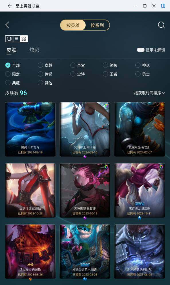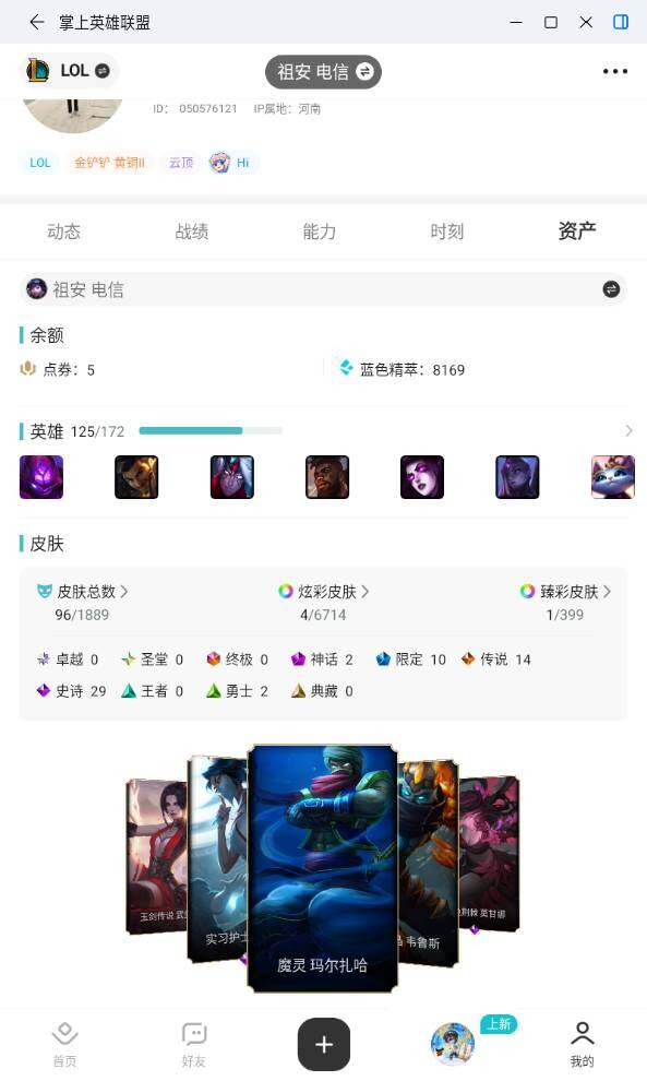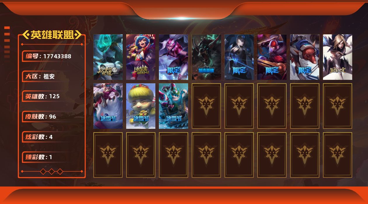 [17743388]未定级段位-125英雄-96皮肤-4炫彩-0终极-2神话-10限定-14传说-29史诗
