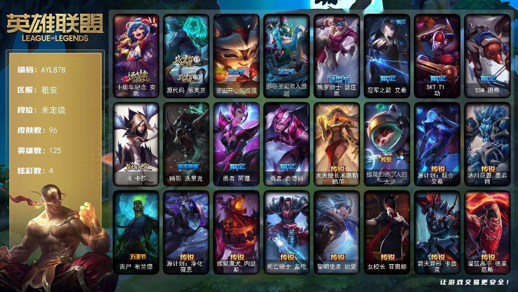 [17743388]未定级段位-125英雄-96皮肤-4炫彩-0终极-2神话-10限定-14传说-29史诗 【神话皮肤】:十周年纪念安妮,源代码乐芙兰 【臻彩皮肤】:冠军之箭艾希凯旋圣装 【冰雪限定】:圣诞开心鬼提莫,邪恶圣诞老人维迦,魄罗骑士瑟庄妮 【限定皮肤】:冠军之箭艾希,SKTT1劫,SSW图奇,iG卡莎,暗影沃里克,勇者阿狸,勇者奈德丽 【传说皮肤】:大天使长米迦勒凯尔,提莫约德尔人的一大步,源计划联合艾希,冰川巨兽墨菲特,丧尸布兰德,源计划净化薇恩,炼狱魔犬内瑟斯,死亡骑士盖伦,黎明使者锐雯,女校长菲奥娜,霸天异形卡兹克,灌篮高手德莱厄斯,黑夜使者亚索,星之守护者金克丝 【史诗皮肤】:翼骑统领赵信,摄魂男爵弗拉基米尔,战争机器赛恩,少林武僧贾克斯,黑色荆棘莫甘娜,夜刃艾瑞莉娅,寒冰女皇迦娜,霸天巨兽墨菲特,海贼魅影卡特琳娜,源计划雄心卡特琳娜,蓝焰梦魔魔腾,龙骑统帅嘉文四世,至高之拳李青,实习护士阿卡丽,至高君王玛尔扎哈,血色精锐锐雯,腥红之月鬼武者慎,战国大名慎,银河魔装机神希瓦娜,暗影妖狐阿狸,海牛猎手菲兹,银河魔装机神菲兹,源计划火菲奥娜,生化骑士德莱厄斯,西部牛仔亚索,源计划风亚索,腥红之月亚索,源计划雷卢锡安,源计划阴劫 【勇士皮肤】:拆弹专家黑默丁格,烈焰猛士奥拉夫 【其他皮肤】:幽蓝梦魇加里奥,暗影易,玉剑传说无极,原野伐木工赛恩,游击队员崔丝塔娜,西部牛仔厄运小姐,勇敢的心泰达米尔,冰球队员贾克斯,机械污染辛吉德,首领图奇,北风冻原图奇,黑金诱惑图奇,横行霸道图奇,绝影神偷图奇,欧米伽小队毒针狙击手,老兵普朗克,大力水手普朗克,日冕女神卡尔玛,荒野之咬雷克顿,鳄霸雷克顿,英仙座珀尔修斯潘森,足球宝贝阿卡丽,空手道凯南,魔灵玛尔扎哈,刺客信条泰隆,玉剑传说武剑仙,极寒慎,失落大陆菲兹,雷霆领主沃利贝尔,北地风暴沃利贝尔,怒熊沃利贝尔,坚韧不屈沃利贝尔,夜魔水晶韦鲁斯,泳池派对德莱文,鬼影森森婕拉,弹幕天使卡莎,奥德赛亚索,狂鲨亚托克斯,源代码娜美