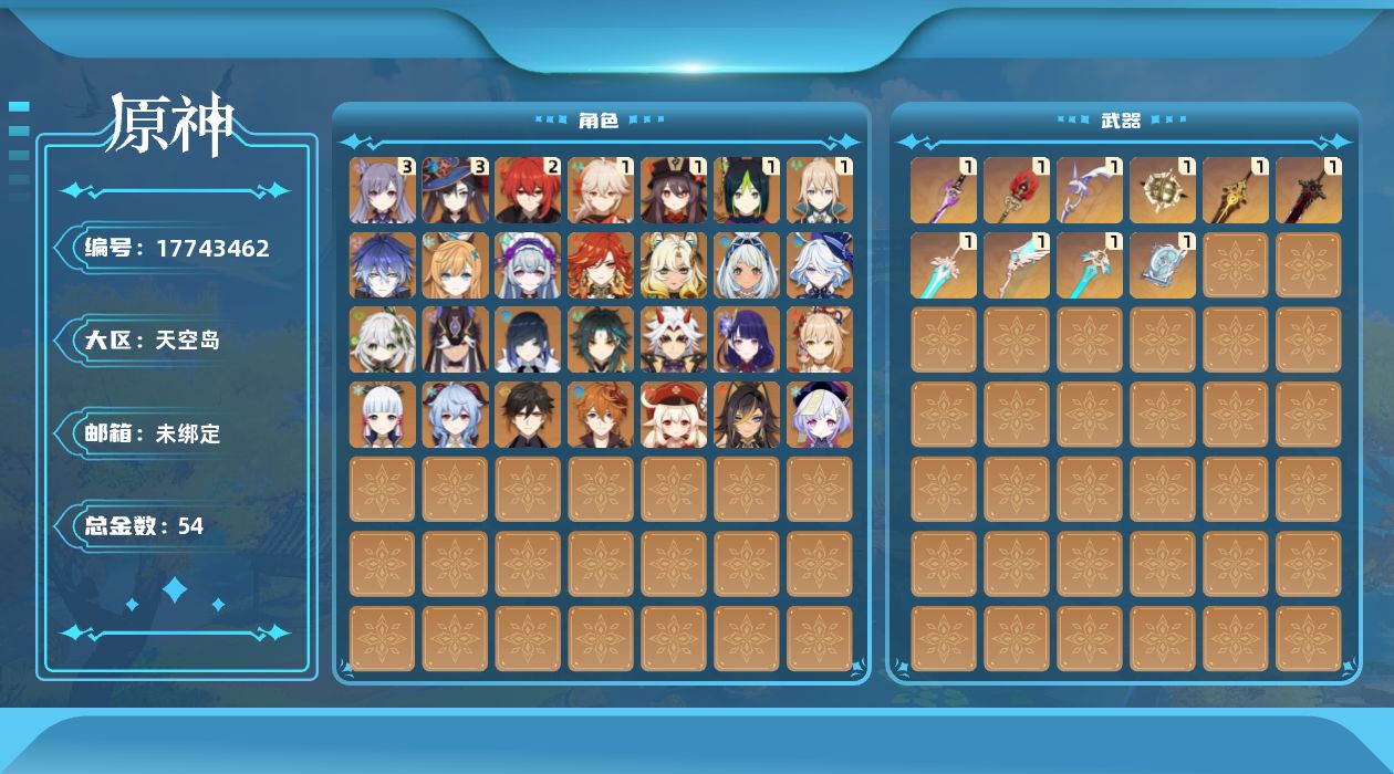 0命芙宁娜,0命迪希雅,0命纳西妲,0命赛诺,1命提纳里,0命夜兰,0命荒泷一斗,0命雷电将军,1命枫原万叶,0命神里绫华,0命钟离,1命胡桃,0命甘雨,0命魈,0命宵宫,0命可莉,0命达达利亚,3命刻晴,0命七七,1命琴,3命莫娜,2命迪卢克,0命希诺宁,0命玛拉妮,0命玛薇卡,0命梦见月瑞希,0命爱可菲,0命菲林斯,精1苇海信标,精1雾切之回光,精1护摩之杖,精1四风原典,精1天空之翼,精1阿莫斯之弓,精1天空之刃,精1尘世之锁,精1狼的末路,精1天空之傲