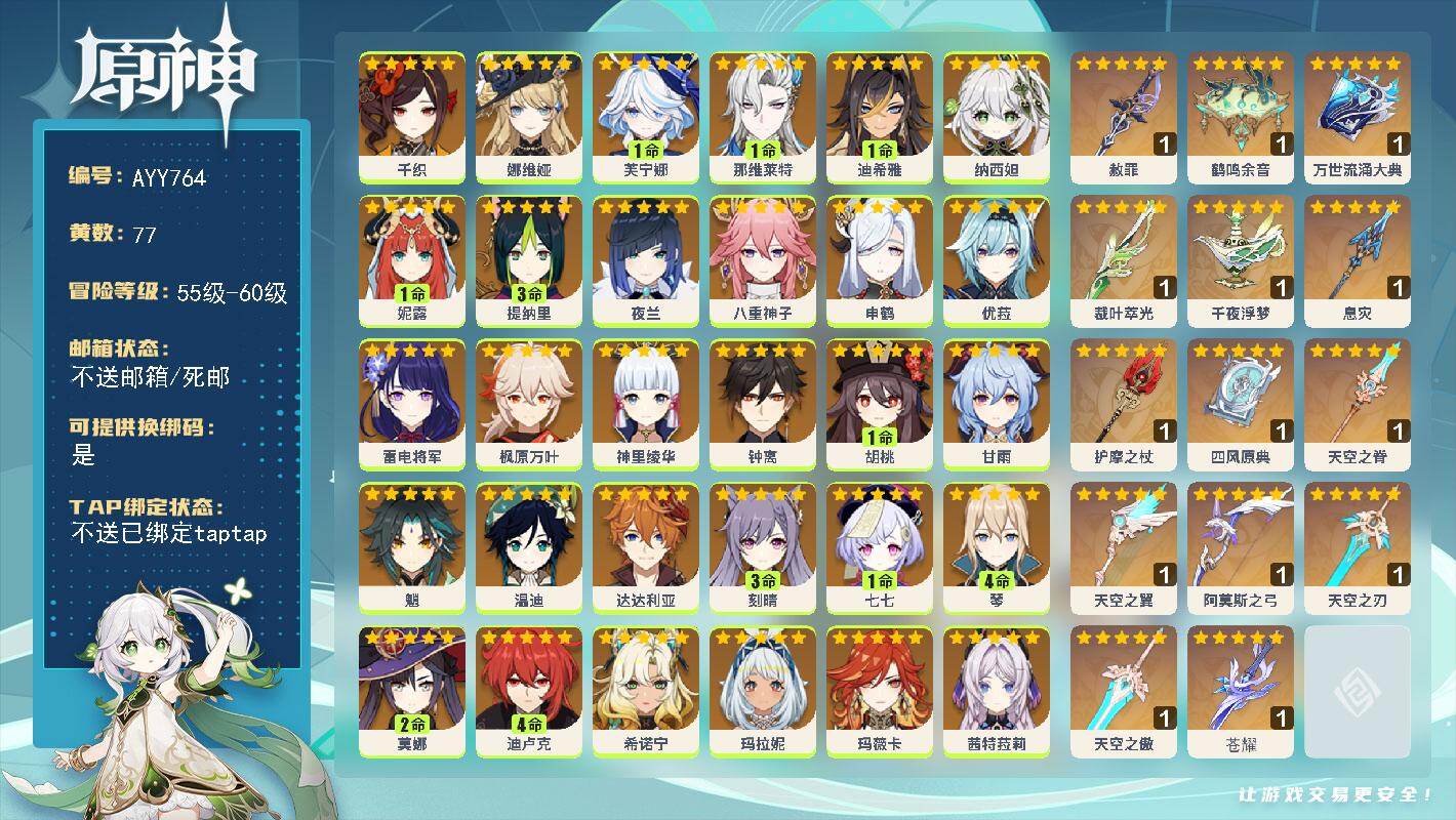 [17743460]60级/77黄/女主/38个五星角色/16个五星武器 0命千织,0命娜维娅,1命芙宁娜,1命那维莱特,1命迪希雅,0命纳西妲,1命妮露,3命提纳里,0命夜兰,0命八重神子,0命申鹤,0命优菈,0命雷电将军,0命枫原万叶,0命神里绫华,0命钟离,1命胡桃,0命甘雨,0命魈,0命温迪,0命达达利亚,3命刻晴,1命七七,4命琴,2命莫娜,4命迪卢克,0命希诺宁,0命玛拉妮,0命玛薇卡,0命茜特菈莉,1命梦见月瑞希,0命瓦雷莎,0命爱可菲,0命丝柯克,0命菈乌玛,0命奈芙尔,0命杜林,0命法尔伽,精1赦罪,精1鹤鸣余音,精1万世流涌大典,精1裁叶萃光,精1千夜浮梦,精1息灾,精1护摩之杖,精1四风原典,精1天空之脊,精1天空之翼,精1阿莫斯之弓,精1天空之刃,精1天空之傲,精1苍耀