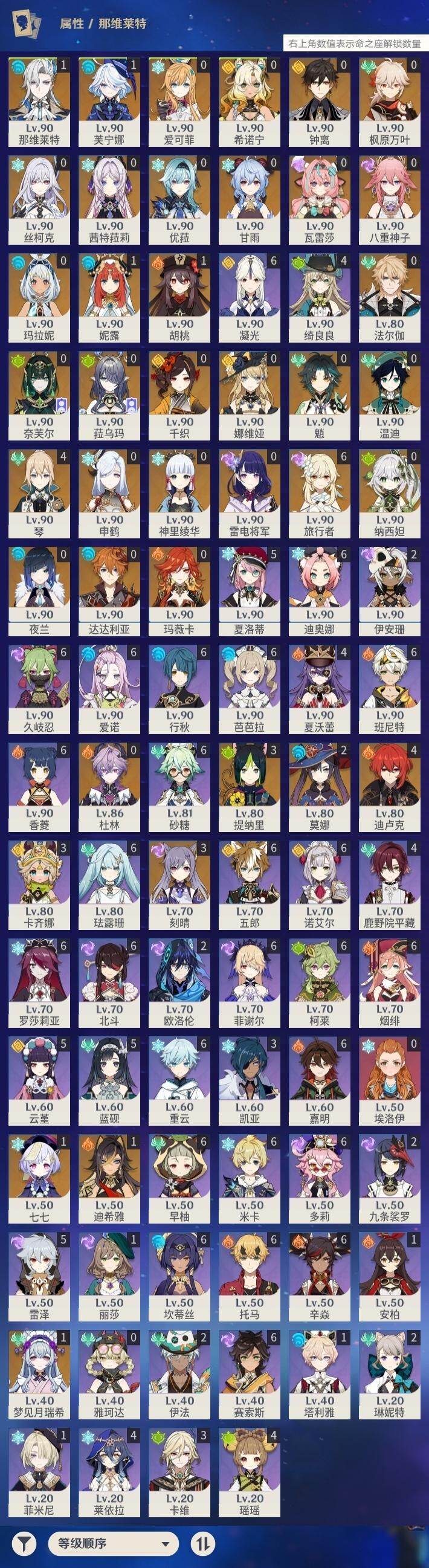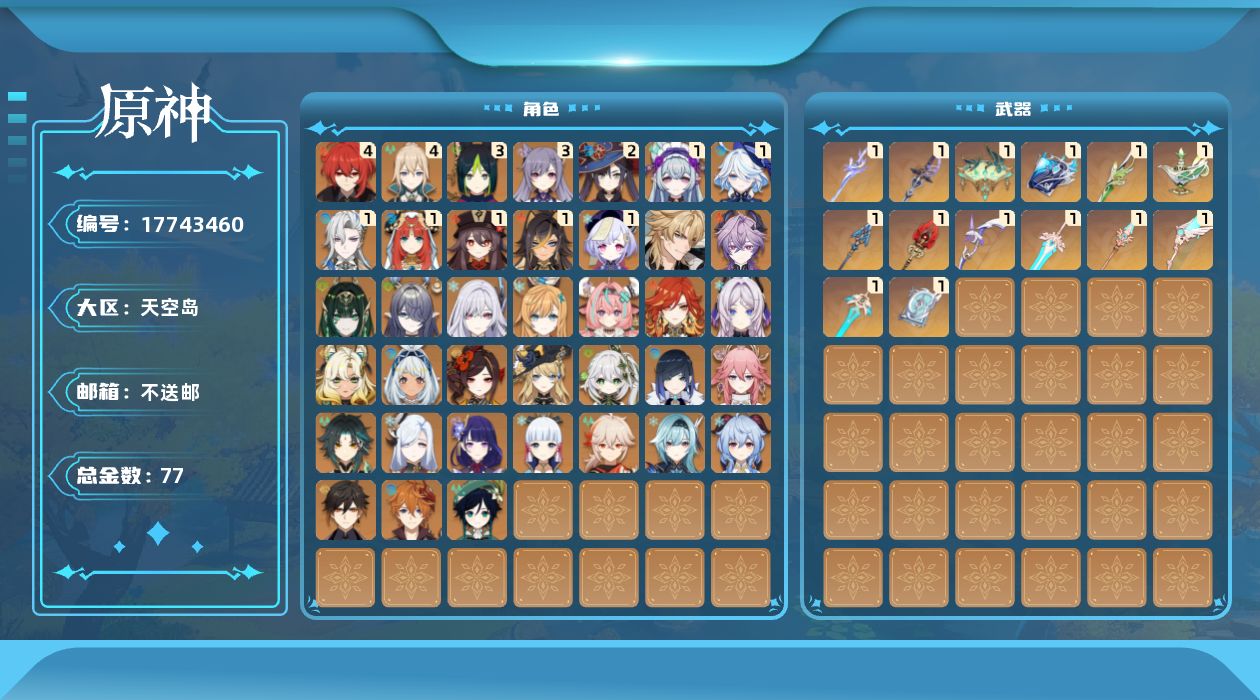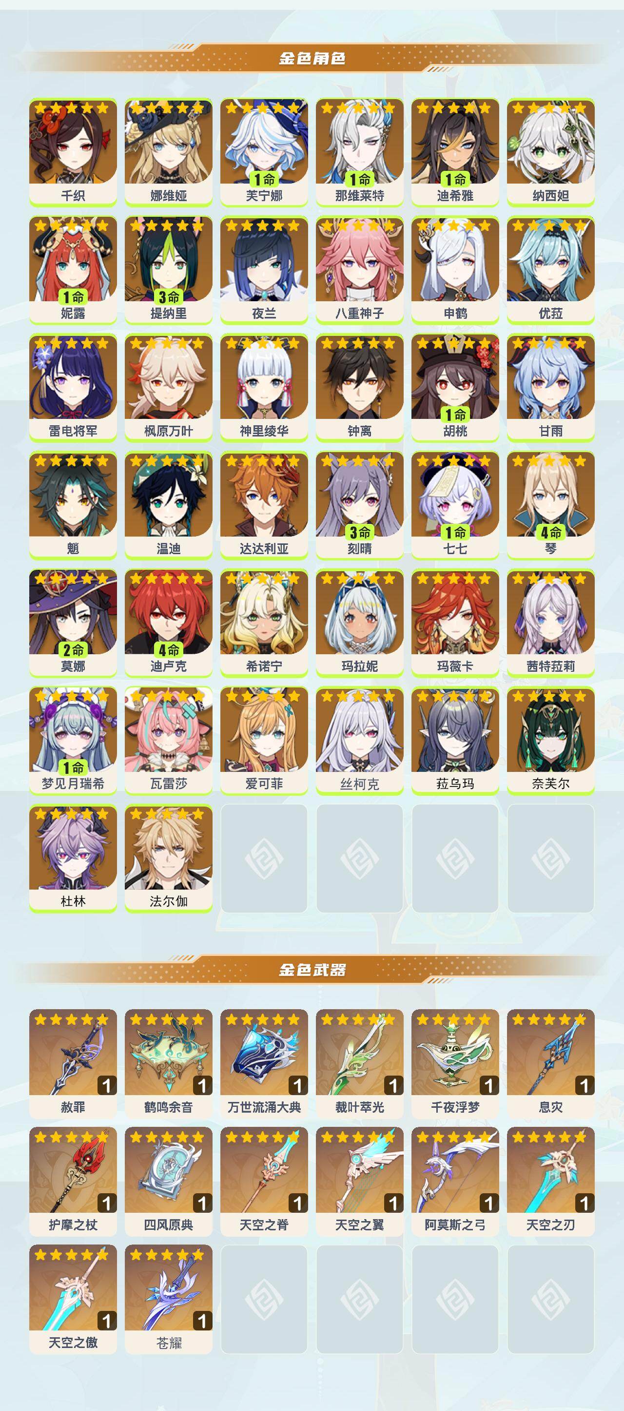 0命千织,0命娜维娅,1命芙宁娜,1命那维莱特,1命迪希雅,0命纳西妲,1命妮露,3命提纳里,0命夜兰,0命八重神子,0命申鹤,0命优菈,0命雷电将军,0命枫原万叶,0命神里绫华,0命钟离,1命胡桃,0命甘雨,0命魈,0命温迪,0命达达利亚,3命刻晴,1命七七,4命琴,2命莫娜,4命迪卢克,0命希诺宁,0命玛拉妮,0命玛薇卡,0命茜特菈莉,1命梦见月瑞希,0命瓦雷莎,0命爱可菲,0命丝柯克,0命菈乌玛,0命奈芙尔,0命杜林,0命法尔伽,精1赦罪,精1鹤鸣余音,精1万世流涌大典,精1裁叶萃光,精1千夜浮梦,精1息灾,精1护摩之杖,精1四风原典,精1天空之脊,精1天空之翼,精1阿莫斯之弓,精1天空之刃,精1天空之傲,精1苍耀