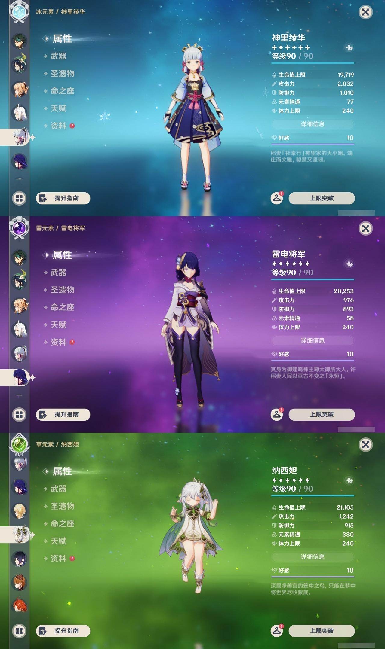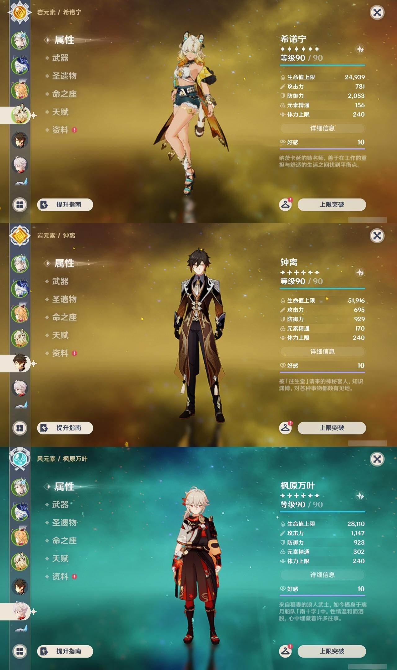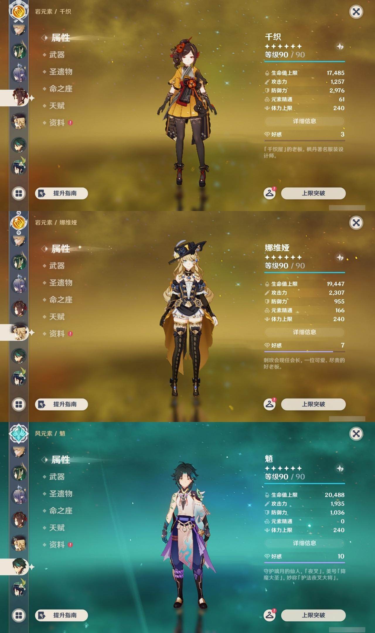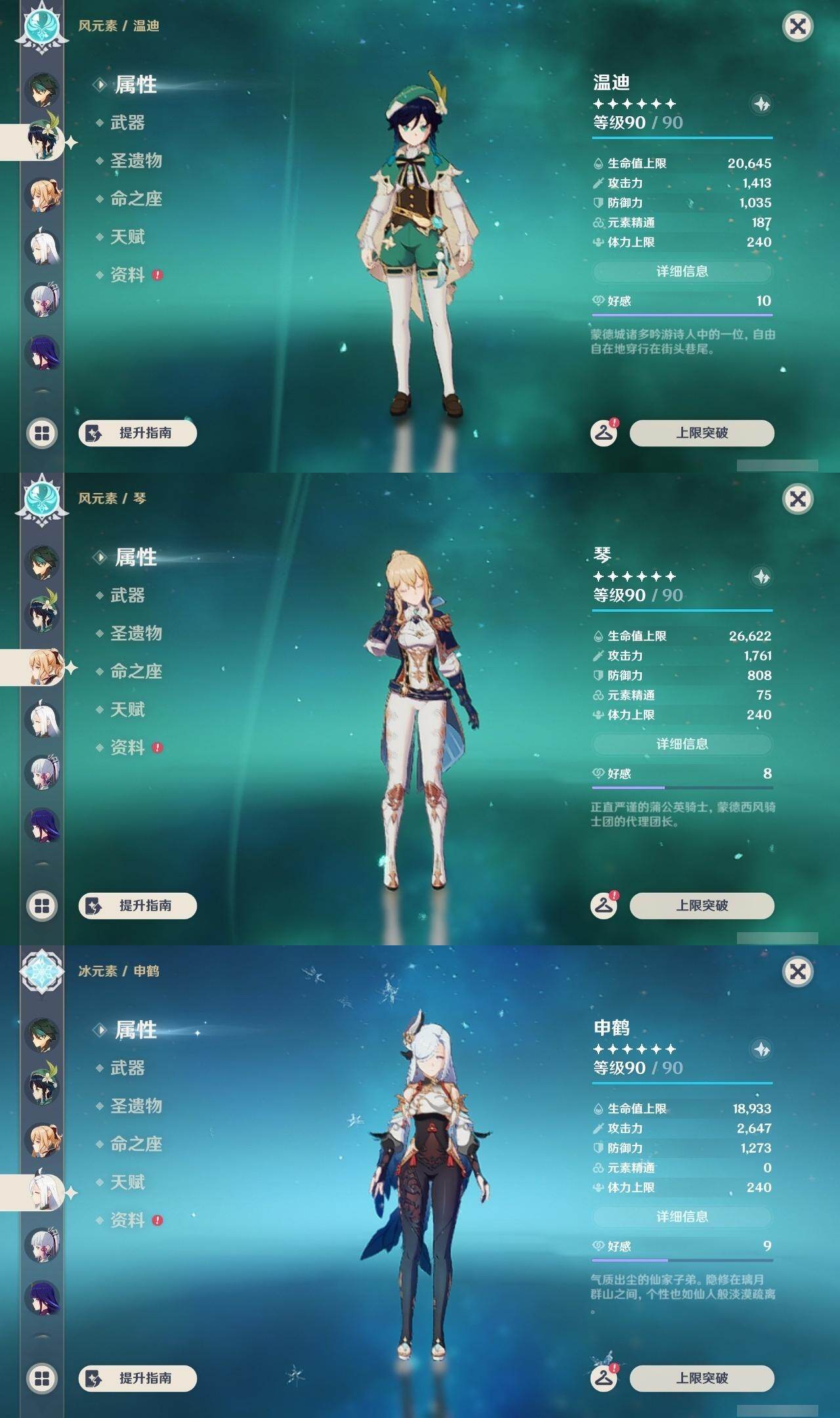 钟离,枫原万叶,优菈,甘雨,八重神子,胡桃,魈,温迪,琴,申鹤,神里凌华,雷电将军,达达利亚,莫娜,迪卢克,刻晴,七七