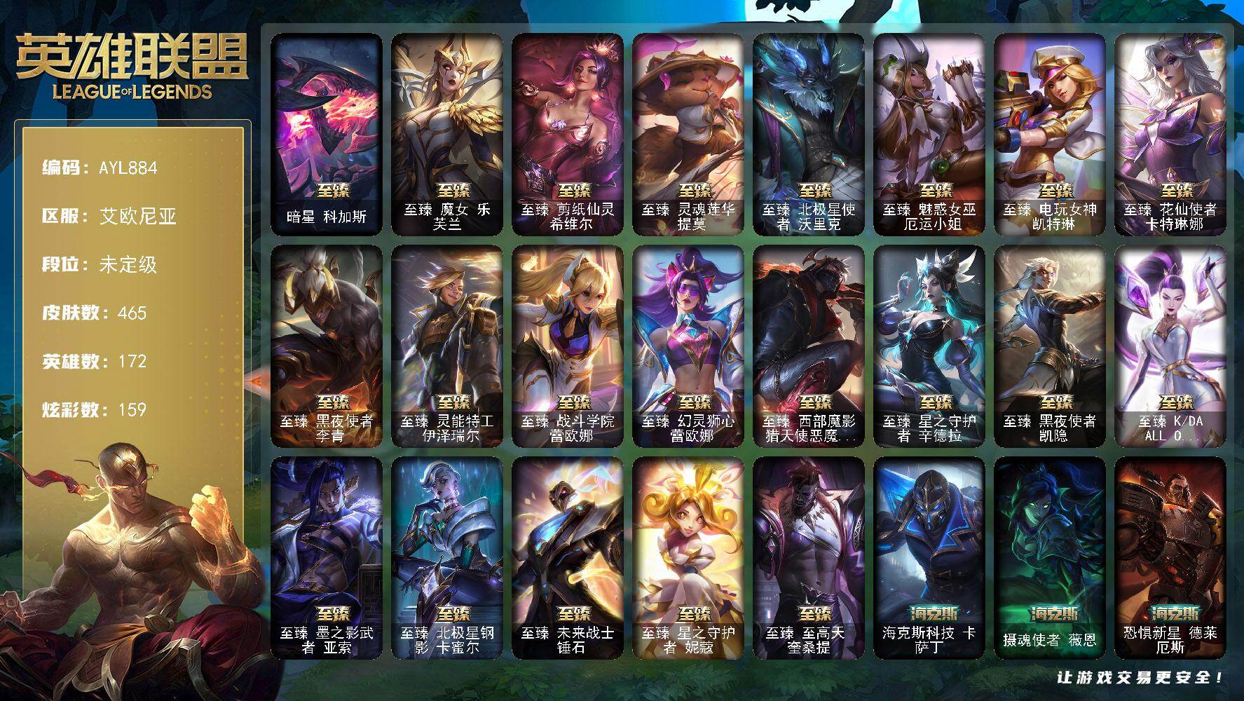 [17745034]未定级段位-172英雄-465皮肤-159炫彩-2终极-24神话-84限定-62传说-77史诗 【神话皮肤】:暗星科加斯 【至臻皮肤】:至臻魔女乐芙兰,至臻剪纸仙灵希维尔,至臻灵魂莲华提莫,至臻北极星使者沃里克,至臻魅惑女巫厄运小姐,至臻电玩女神凯特琳,至臻花仙使者卡特琳娜,至臻黑夜使者李青,至臻灵能特工伊泽瑞尔,至臻战斗学院蕾欧娜,至臻幻灵狮心蕾欧娜,至臻西部魔影猎天使恶魔泰隆,至臻星之守护者辛德拉,至臻黑夜使者凯隐,至臻KDAALLOUT卡莎,至臻墨之影武者亚索,至臻北极星钢影卡蜜尔,至臻未来战士锤石,至臻星之守护者妮蔻,至臻至高天奎桑提 【海克斯皮肤】:海克斯科技卡萨丁,摄魂使者薇恩,恐惧新星德莱厄斯 【臻彩皮肤】:天龙之子卡莎飞龙乘云,无畏骑士瑟庄妮赤子初心,墨之影武者亚索金墨耀影,征服者阿利斯塔炫金,神龙尊者圣龙李青龙腾云起,西部天使赛娜神选天使长,源计划联合艾希红莲之弓,黎明使者锐雯黑夜使者,可爱可爱粉红红布里茨,战斗学院盖伦不死鸟,魔女阿卡丽虚荣,净雪之月莫甘娜冬虹,灌篮高手德莱厄斯金色神话 【年限皮肤】:北辰之威内瑟斯,王国机神苍狼瑟提,王国机神白虎贾克斯,福牛守护者厄斐琉斯,福牛守护者德莱厄斯,天龙之子斯莫德 【情人节限定】:水晶玫瑰斯维因 【冰雪限定】:幸福女神乐芙兰,圣诞狂欢努努和威朗普,狂心冰王图奇,阿木木“主人不要我了”,胡桃夹子萨科,英勇玩具兵普朗克,邪恶圣诞老人维迦,夺命美人卡特琳娜,圣诞老人古拉加斯,魄罗骑士瑟庄妮,冰雪节格雷福斯,冰雪兽纳尔,北极星神黛安娜,北极星使者彗 【终极皮肤】:斗魂觉醒莎弥拉,灵魂守卫乌迪尔 【限定皮肤】:卧虎藏龙贾克斯,冠军之血希瓦娜,冠军之矛卡莉丝塔,冠军之刃锐雯2016,冠军之志瑞兹,2023全球总决赛雷克顿,Fnatic古拉加斯,Fnatic迦娜,暗杀星奥莉安娜,暗杀星蒙多,暗杀星努努和威朗普,SKTT1贾克斯,SSW泰隆,SSW雷恩加尔,SKTT1雷克顿,SKTT1瑞兹,SKTT1伊莉丝,SKTT1艾克,iG菲奥娜,iG艾瑞莉娅,iG卡莎,iG乐芙兰,FPX普朗克,DWG奈德丽,EDG格雷福斯,EDG佛耶戈,EDG佐伊,EDG厄斐琉斯,EDG悠米,DRX亚托克斯,玉剑传说无影,灵能特工易,暗裔英雄盖伦,胜利女神瑟庄妮,胜利凤凰艾尼维亚,胜利之王泰达米尔,胜利巨口克格莫,胜利女神娑娜,死亡誓约卡特琳