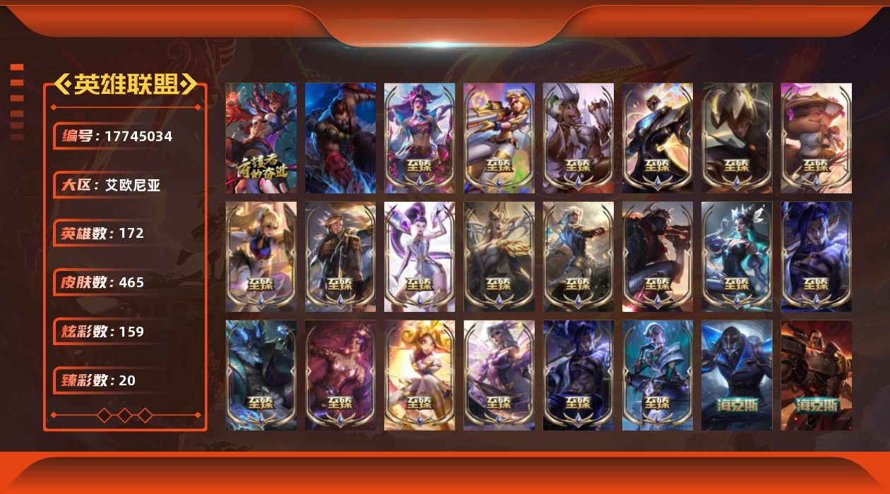 [17745034]未定级段位-172英雄-465皮肤-159炫彩-2终极-24神话-84限定-62传说-77史诗