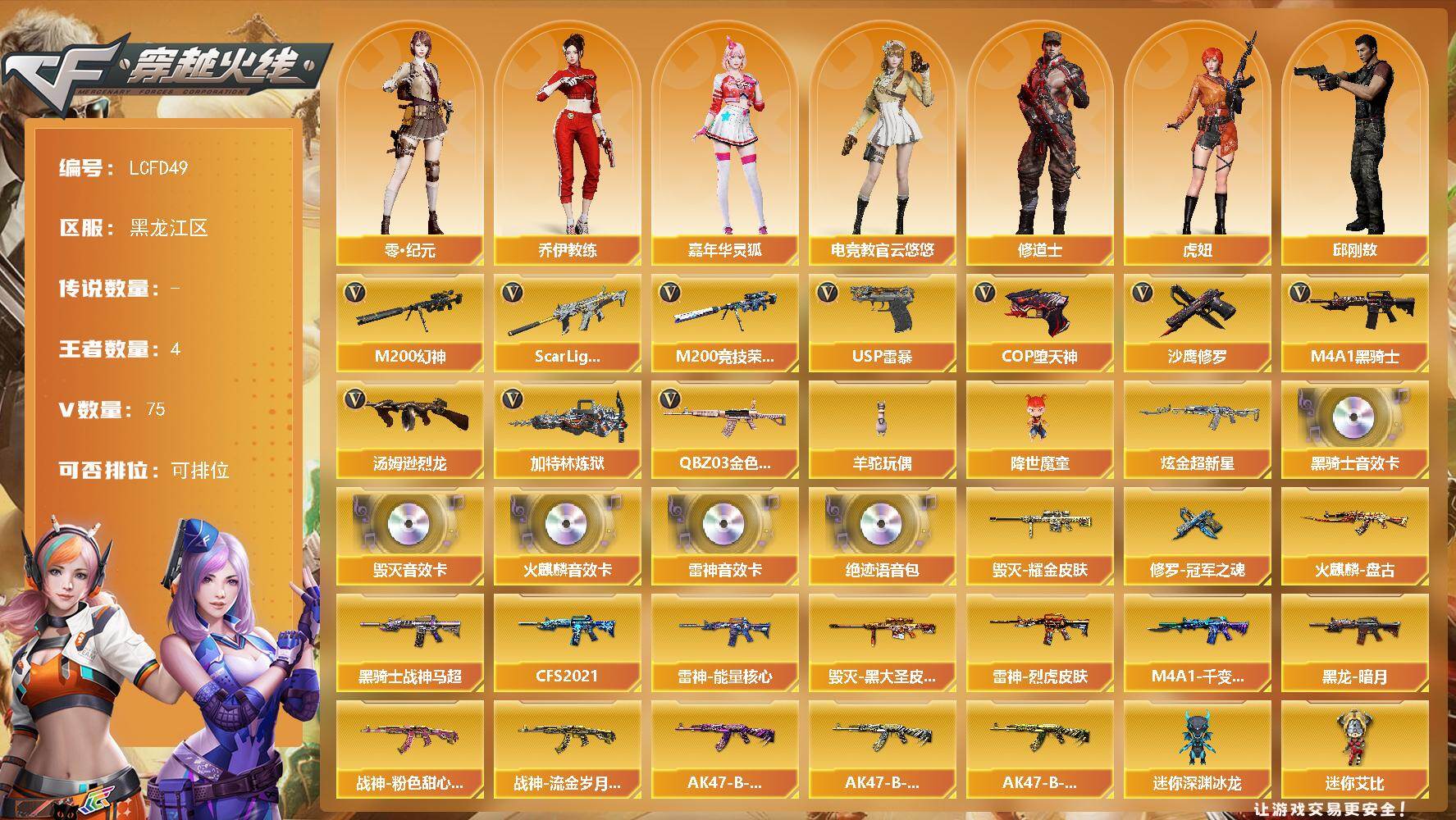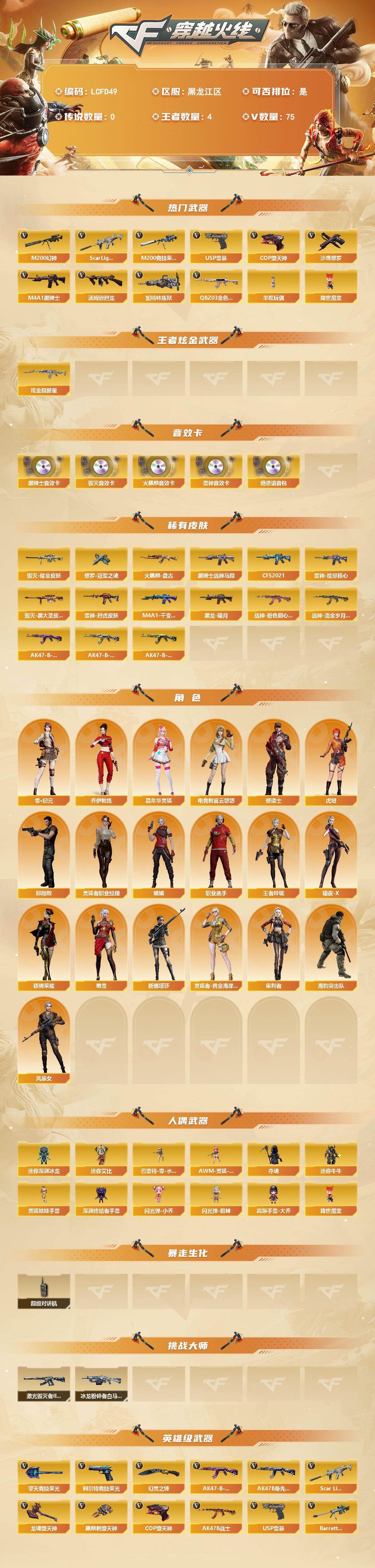 [17745789]黑龙江区-79V-4王者武器数-1炫金武器数 【热门武器】:QBZ03-金色蔷薇,Scar Light-白虎,M200-幻神,M200-竞技荣光,M4A1-黑骑士,汤姆逊-烈龙*3,加特林-炼狱,羊驼玩偶,降世魔童,USP-雷暴,COP-堕天神,沙鹰-修罗*2 【王者炫金武器】:炫金超新星 【音效卡】:AK47-火麒麟音效卡,M4A1-雷神音效卡,M4A1-黑骑士音效卡,Barrett-毁灭音效卡,绝迹语音包 【皮肤】:雷神-能量核心,雷神-烈虎皮肤,火麒麟-盘古,毁灭耀金皮肤,毁灭-黑大圣皮肤,M4A1-千变-孔明皮肤,黑龙-暗月,黑骑士-战神马超,黑骑士-CFS2021,战神-粉色甜心皮肤,战神-流金岁月皮肤,AK47-B-常胜将军-曹操*2,AK47-B-常胜将军-刘备,AK47-B-常胜将军-孙权,修罗-冠军之魂 【角色】:电竞教官-云悠悠,审判者,零·纪元,王者玲珑,乔伊教练,修道士,暗夜-X,风暴女*2,虎妞,嘉年华灵狐,娟娟,灵狐者-黄金海岸,灵狐者-职业经理,邱刚敖,蜀雪,铁骑荣耀,新娜塔莎,职业选手,海豹突击队 【人偶武器】:巴雷特-零-水下丽影,AWM-灵狐-15周年嘉年华,迷你深渊冰龙,夺魂,迷你牛牛,深渊终结者手雷,闪光弹-小乔,闪光弹-貂蝉,高爆手雷-大乔,迷你艾比,灵狐娃娃手雷,降世魔童 【暴走生化】:超级对讲机 【挑战大师】:冰龙粉碎者-白马银枪,激光毁灭者III-白马银枪 【英雄级武器】:M4A1-千变,AK47-火麒麟,M4A1-黑龙,M4A1-雷神,M4A1-黑骑士,AK47-无影,AN94-超新星,M4A1-堕天神,Scar Light-白虎,M4A1-玫瑰精灵,QBZ03-金色蔷薇,9A91-烈火,AK-47-猩红传说,王者火魄-觉醒版,AK47-B-常胜将军,QBZ-03-王者蔷薇-觉醒版,AK47-B-身先士卒,AK47-B-战士,AWM-天龙,Barrett-毁灭,M200-幻神,M200-竞技荣光,Barrett-暗月传说,加特林-炼狱,汤姆逊-烈龙*3,沙鹰-修罗*2,沙鹰-天神*3,USP-雷暴,COP-堕天神,柯尔特-竞技荣光,Glock18-武圣,屠龙*3,龙啸,麒麟刺-堕天神*3,擎天,幻灵之锋,擎天-竞技荣光,龙啸-堕天神*2,王者之锋-觉醒版,王者之啸-觉醒版,高爆手雷-堕天神*7,高爆手雷-幻灵,高爆