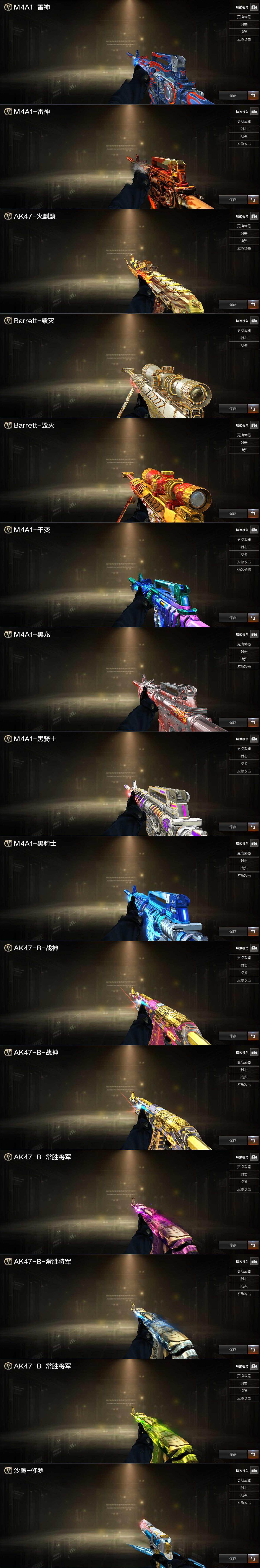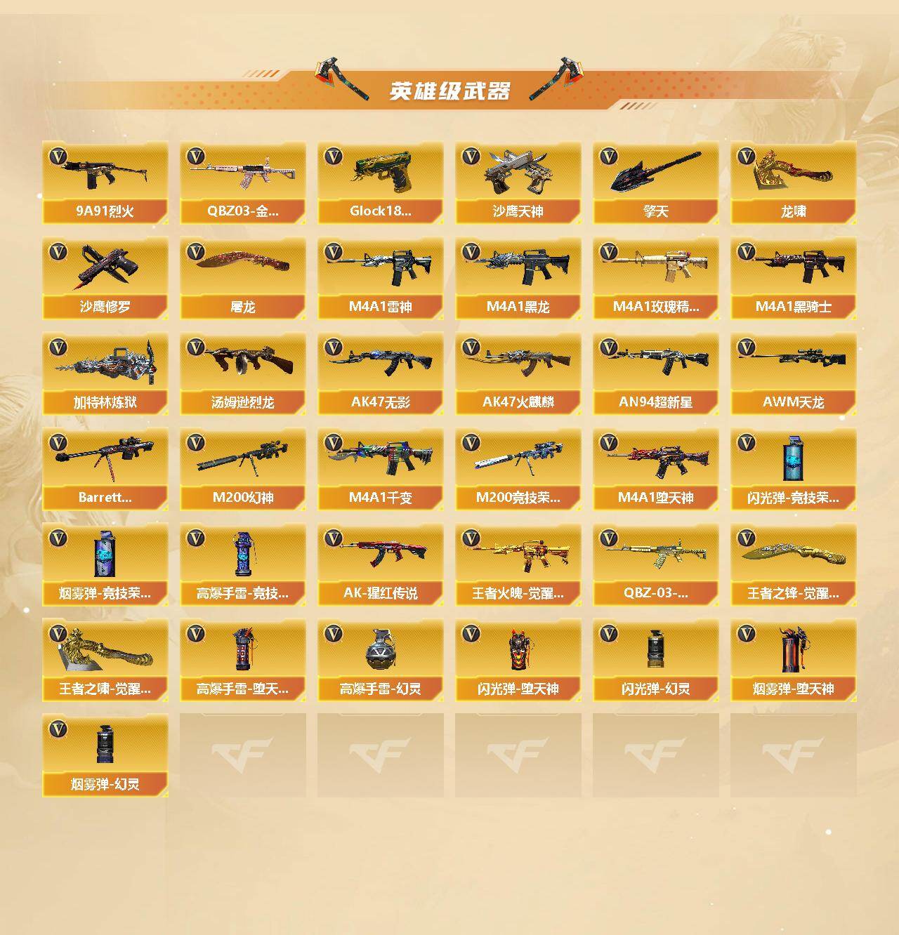 【英雄级武器】:M4A1-千变,AK47-火麒麟,M4A1-黑龙,M4A1-雷神,M4A1-黑骑士,AK47-无影,AN94-超新星,M4A1-堕天神,Scar Light-白虎,M4A1-玫瑰精灵,QBZ03-金色蔷薇,9A91-烈火,AK-47-猩红传说,王者火魄-觉醒版,AK47-B-常胜将军,QBZ-03-王者蔷薇-觉醒版,AK47-B-身先士卒,AK47-B-战士,AWM-天龙,Barrett-毁灭,M200-幻神,M200-竞技荣光,Barrett-暗月传说,加特林-炼狱,汤姆逊-烈龙*3,沙鹰-修罗*2,沙鹰-天神*3,USP-雷暴,COP-堕天神,柯尔特-竞技荣光,Glock18-武圣,屠龙*3,龙啸,麒麟刺-堕天神*3,擎天,幻灵之锋,擎天-竞技荣光,龙啸-堕天神*2,王者之锋-觉醒版,王者之啸-觉醒版,高爆手雷-堕天神*7,高爆手雷-幻灵,高爆