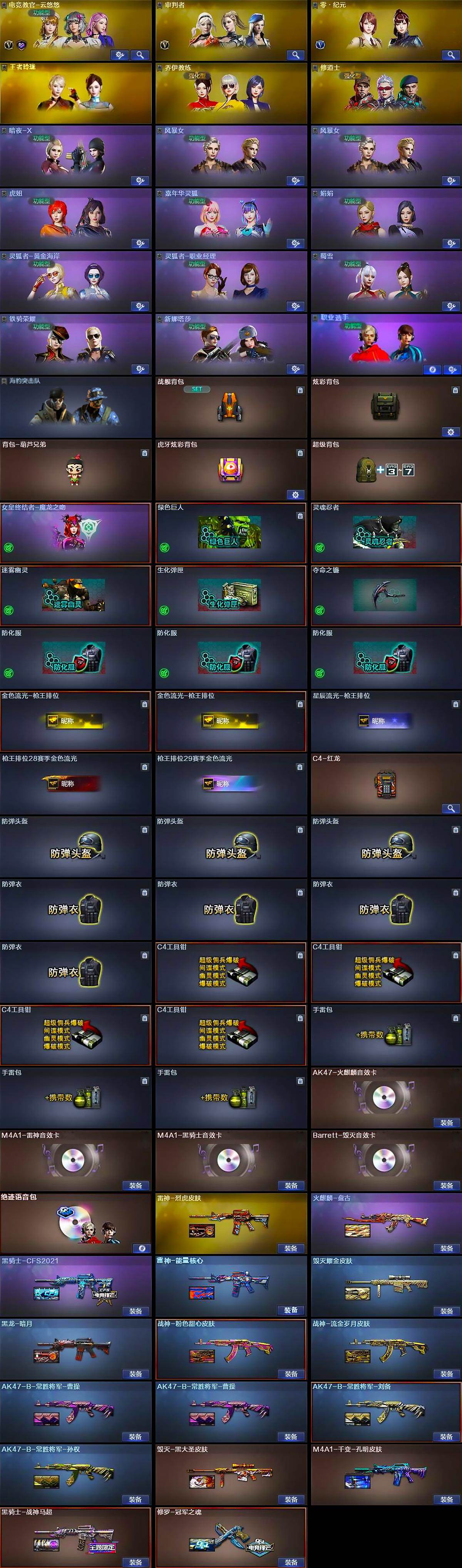 【皮肤】:雷神-能量核心,雷神-烈虎皮肤,火麒麟-盘古,毁灭耀金皮肤,毁灭-黑大圣皮肤,M4A1-千变-孔明皮肤,黑龙-暗月,黑骑士-战神马超,黑骑士-CFS2021,战神-粉色甜心皮肤,战神-流金岁月皮肤,AK47-B-常胜将军-曹操*2,AK47-B-常胜将军-刘备,AK47-B-常胜将军-孙权,修罗-冠军之魂