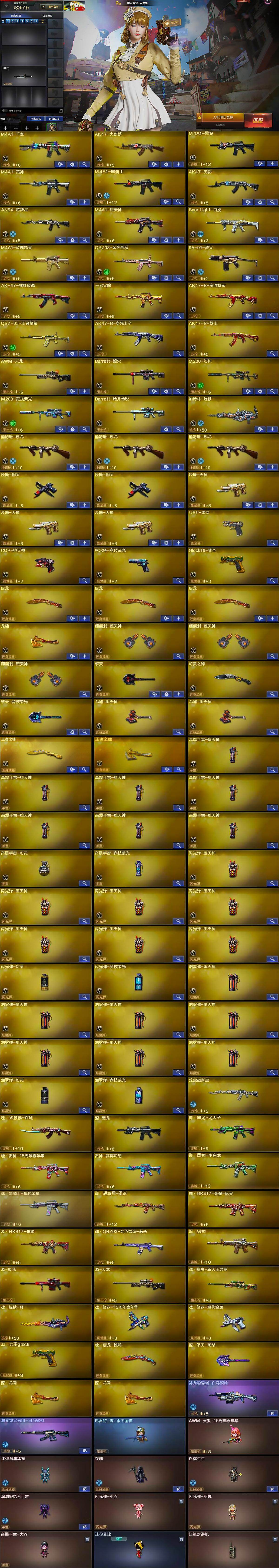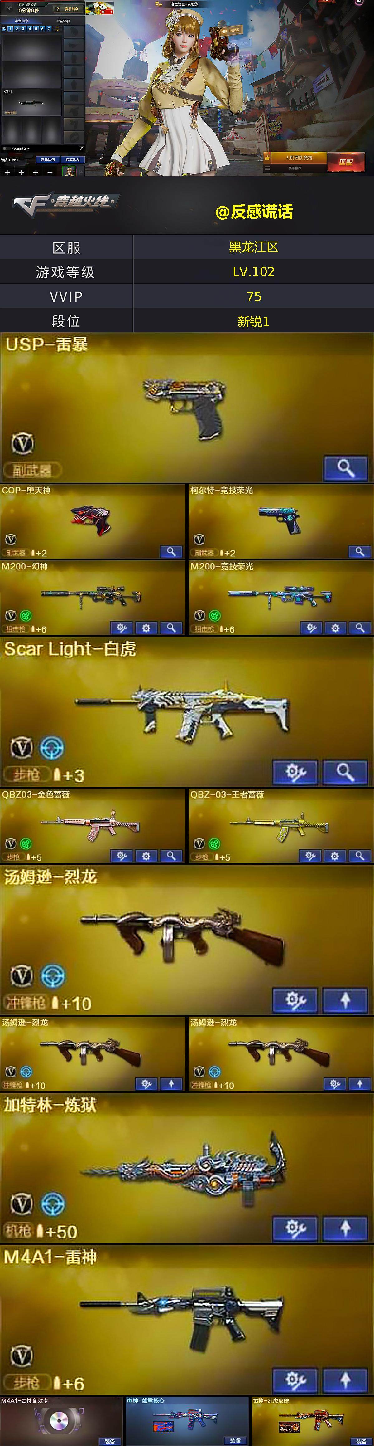 【热门武器】:QBZ03-金色蔷薇,Scar Light-白虎,M200-幻神,M200-竞技荣光,M4A1-黑骑士,汤姆逊-烈龙*3,加特林-炼狱,羊驼玩偶,降世魔童,USP-雷暴,COP-堕天神,沙鹰-修罗*2