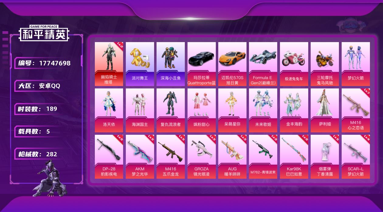 [17747698]安卓 手Q-1神装-9粉装-15特效枪-5载具-6粉色飞行器-95004热力值-17王牌印记-189套装-282枪皮【红色神装等级】:幽焰骑士-维塔(二级)【红色角色神装】:幽焰骑士-维塔【热门品类】:粉装-梦幻火箭,套装-浪漫天命,套装-派对舞王,套装-深海小丑鱼,角色-军刀雅典娜,套装-龟仙人,套装-暗影哥特,套装-粉红小猪,角色-Mark.06【粉色套装】:粉装-梦幻火箭,角色-洛天依,粉装-海渊国主,角色-复仇流浪者,粉装-飒粉甜心,角色-呆萌星弥,粉装-未来歌姬,粉装-金丰海韵,角色-萨利娅【粉色枪皮等级】:AKM-梦之光华(五级),AKM-幽焰骑士(三级),SCAR-L-梦幻火箭(四级),M416-五爪金龙(五级),M416-心之恋语(七级),GROZA-镜光银凌(五级),AUG-暖羊咩咩(五级),M762-青锋波束(五级),UMP45-恐龙拽拽(四级),Kar98K-巳巳如意(五级),Mk14-福马献瑞(五级),DP-28-千金淑猫(四级),DP-28-豹影疾电(五级),烟雾弹-丁香清露(五级),破片手榴弹-热量炸弹(四级)【粉色载具】:玛莎拉蒂Quattroporte(夜幕蓝),迈凯伦570S(旭日黄),Formula E Gen2(巅峰兰),极速兔兔车,鬼马风驰,僚机-萌兔起飞【粉色枪皮】:AKM-梦之光华,AKM-幽焰骑士,SCAR-L-梦幻火箭,M416-五爪金龙,M416-心之恋语,GROZA-镜光银凌,AUG-暖羊咩咩,M762-青锋波束,UMP45-恐龙拽拽,Kar98K-巳巳如意,Mk14-福马献瑞,DP-28-千金淑猫,DP-28-豹影疾电,烟雾弹-丁香清露,破片手榴弹-热量炸弹【粉色飞行器】:炫彩糖果飞行器,纯梦嫁纱飞行翼,超新星飞行器,幽焰列车飞行器,戏水时光飞行器