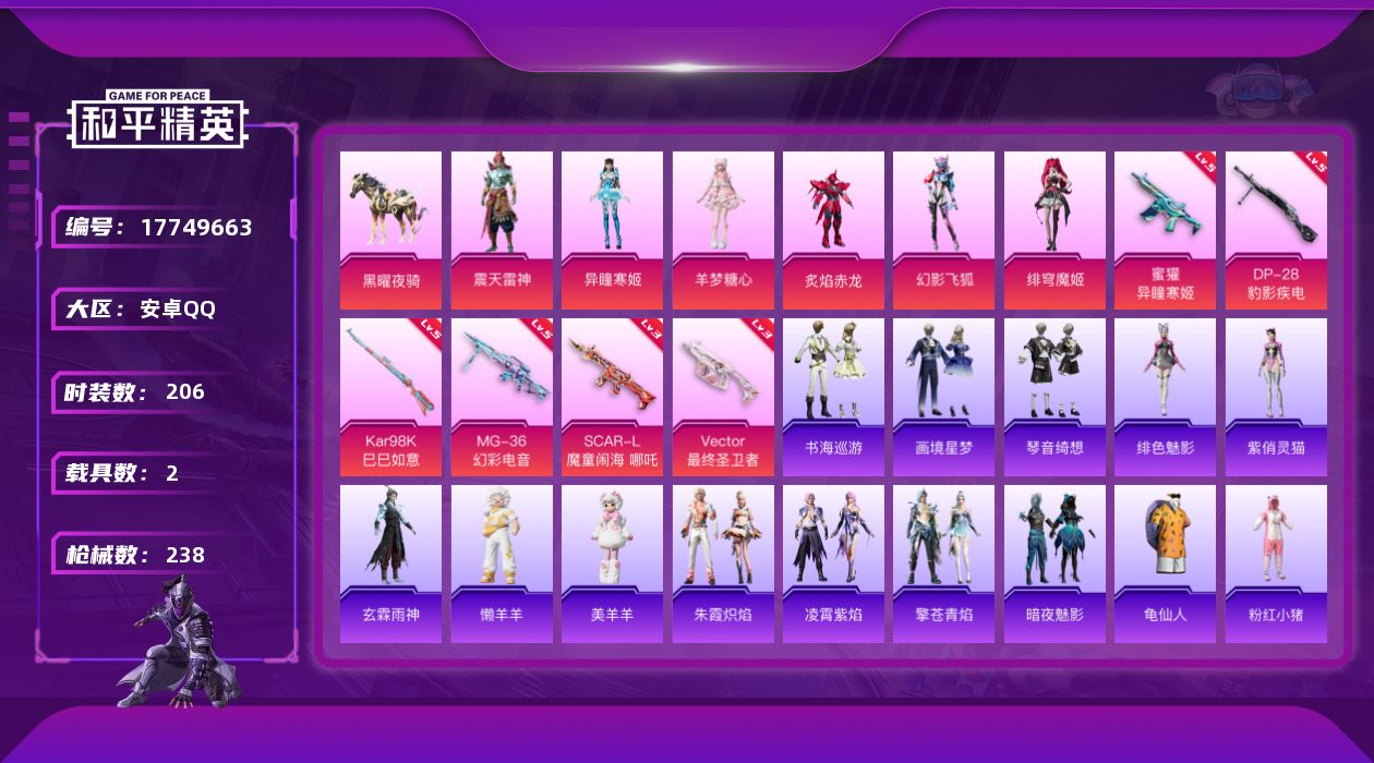 [17749663]安卓 手Q-1神装-9粉装-8特效枪-2载具-10粉色飞行器-84447热力值-14王牌印记-206套装-238枪皮