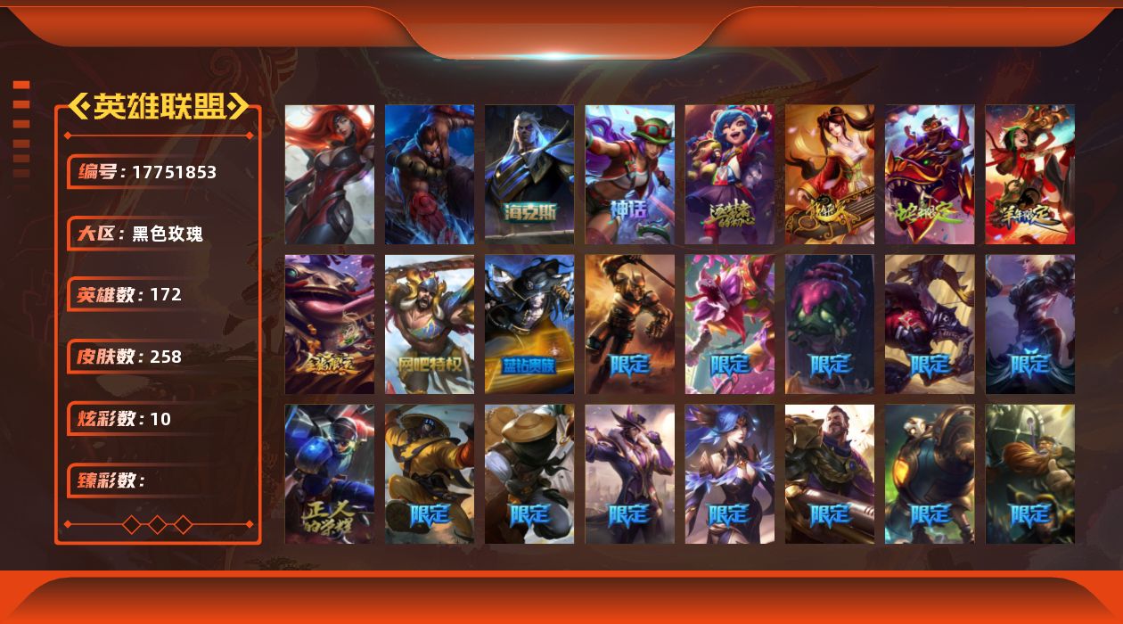 [17751853]黄金段位-172英雄-258皮肤-10炫彩-2终极-3神话-42限定-22传说-70史诗