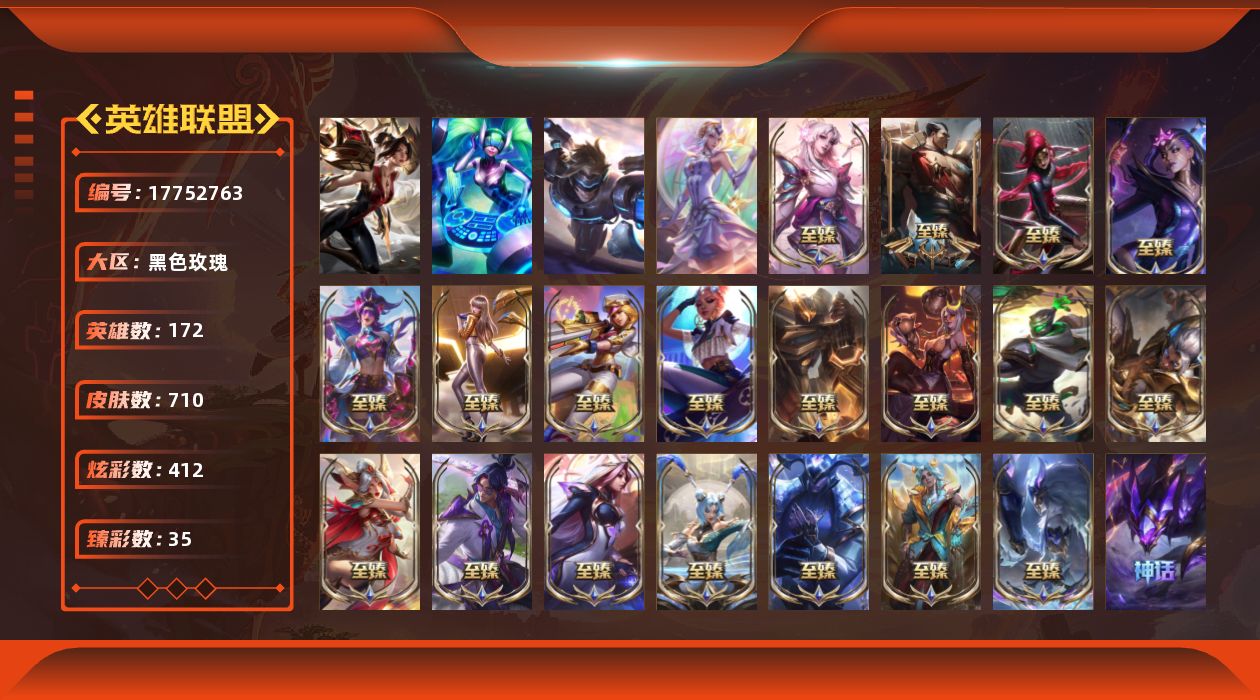[17752763]未定级段位-172英雄-710皮肤-412炫彩-3终极-32神话-115限定-74传说-99史诗