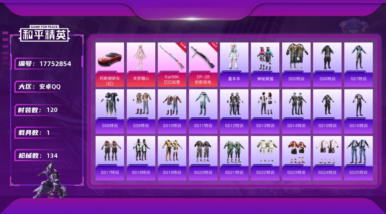 [17752854]安卓 手Q-1粉装-2特效枪-1载具-2粉色飞行器-40778热力值-7王牌印记-120套装-134枪皮